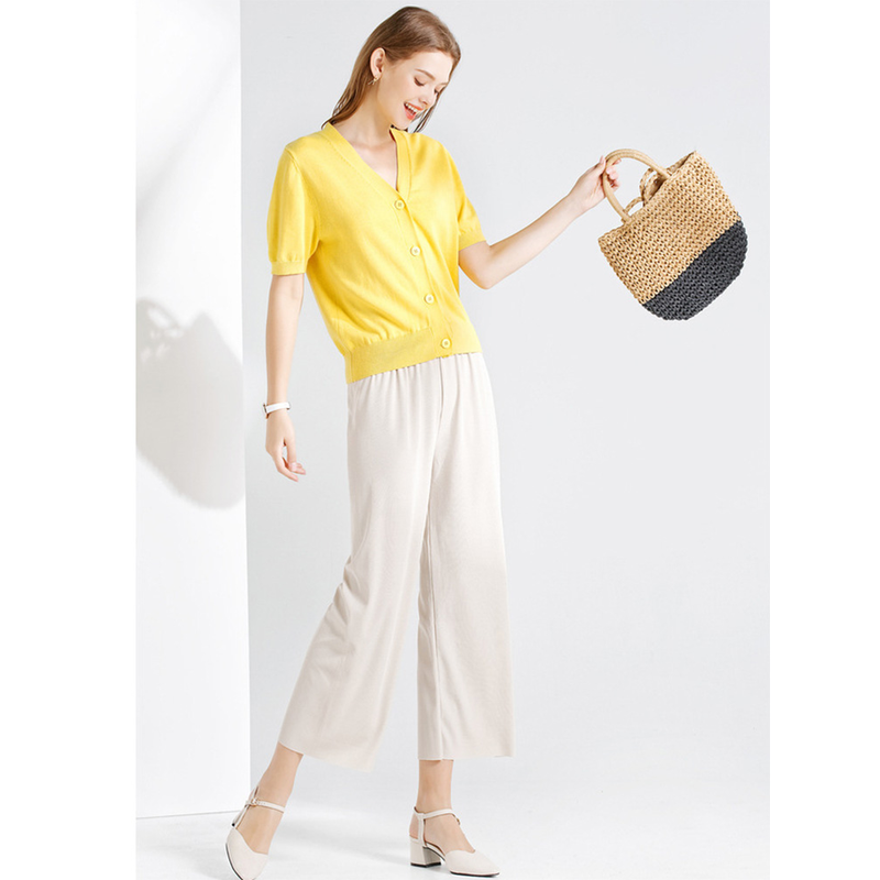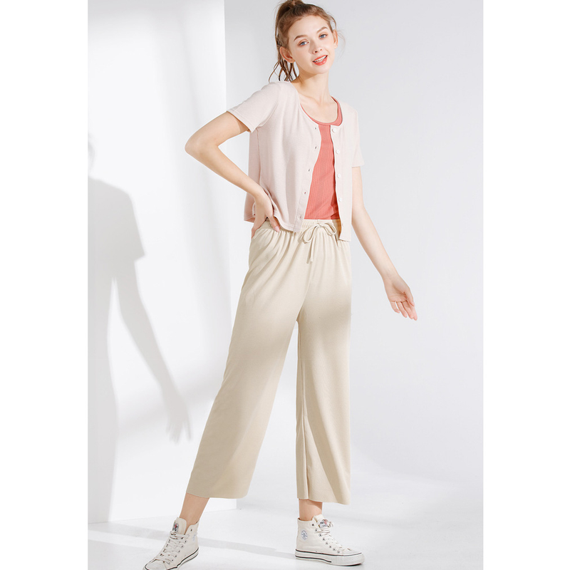 Women Ankle-Length Wide Leg Pants Casual Summer Solid Elastic Waist Loose Ice Silk Pants Spring Summer Female Trousers