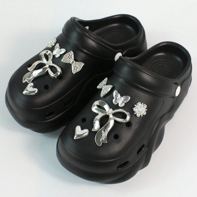 Women DIY Silver Butterfly-Knot Fashion Bow Decor Clogs Summer Sping Autumn Beach Sandals Cave Hole Garden Shoes Students Girls