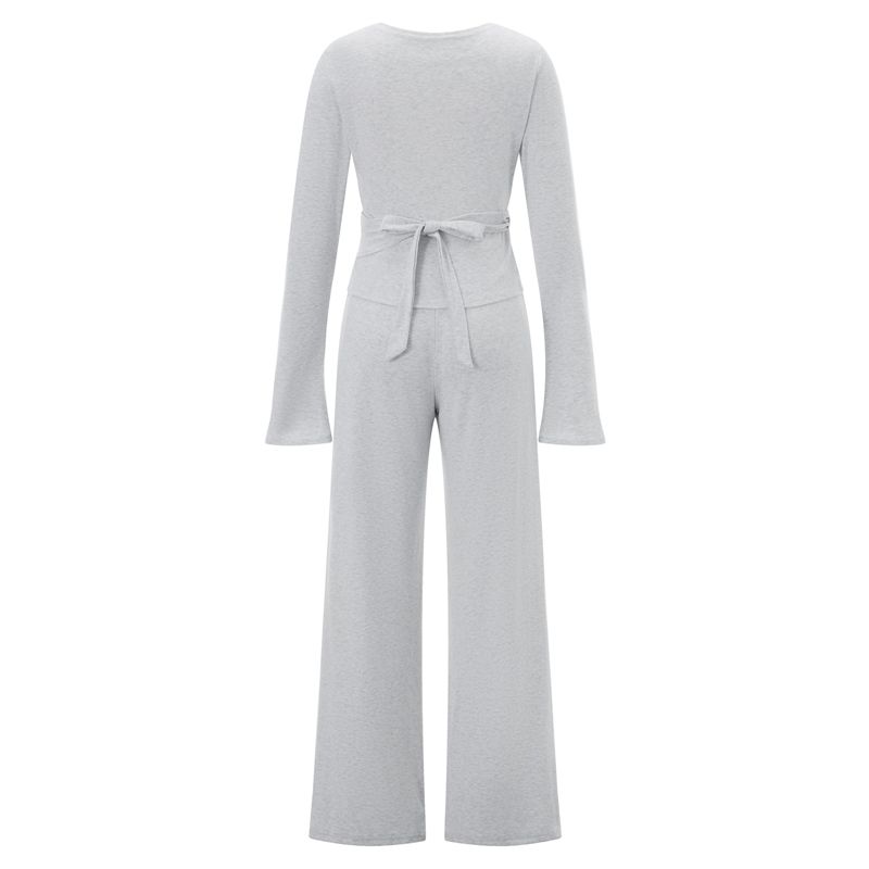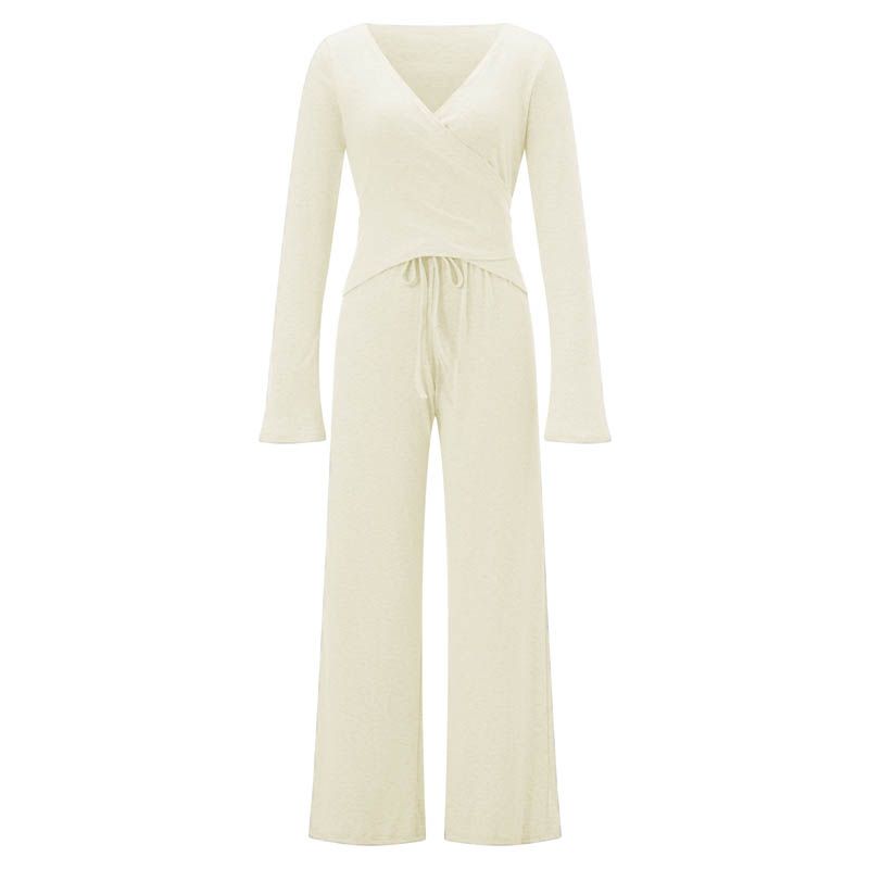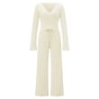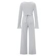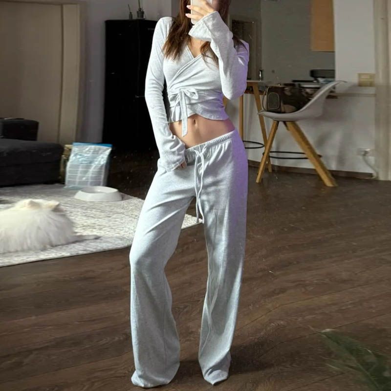 Women Fashion Lounge Set Vintage 2 Piece Outfit V Neck Waist Tie T-shirt + Elastic Waist Pants Autumn Long Sleeve Crop Tops