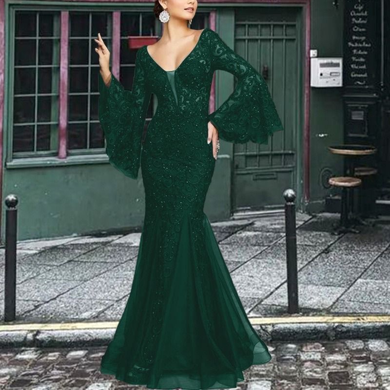 Women Long Dress Sexy Flare Sleeve Lace Embroidery Dresses Elegant High Waist Night Vestidos Female Party Evening Maxi Dress