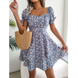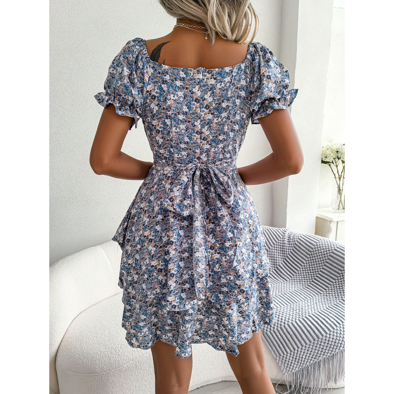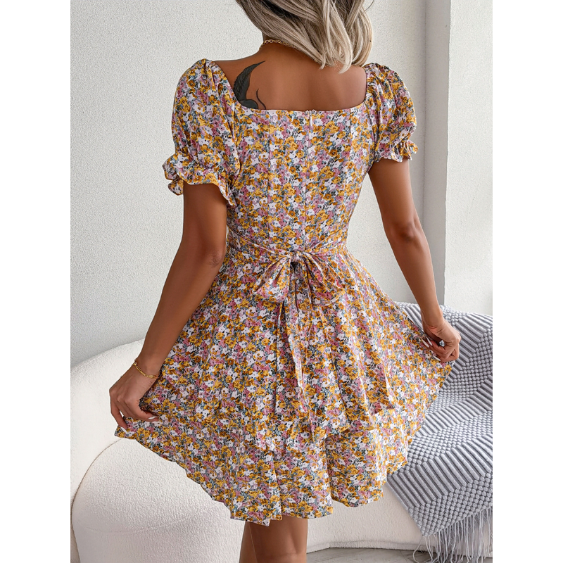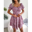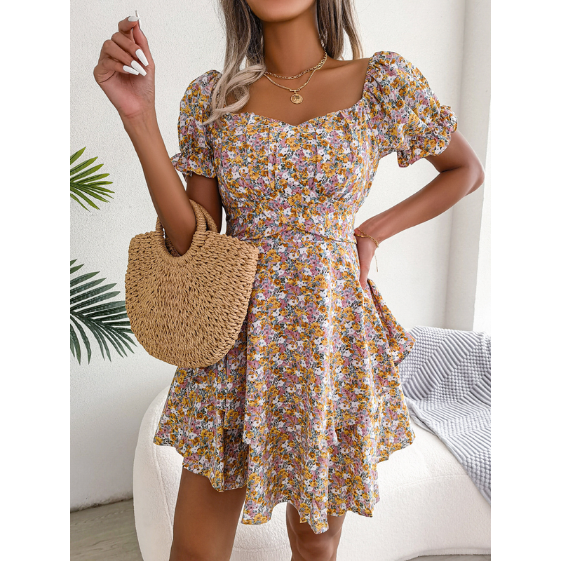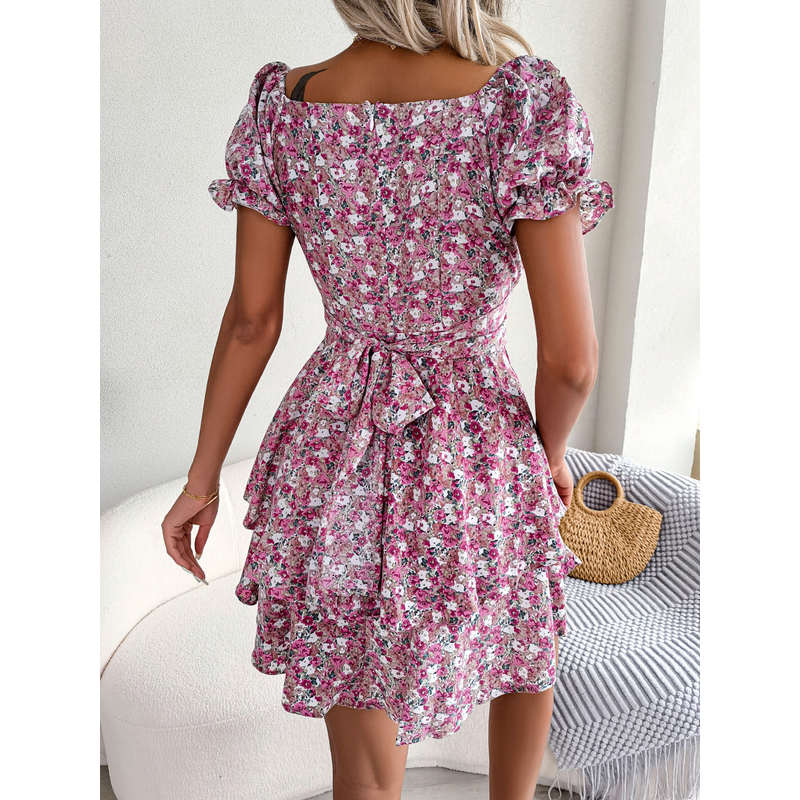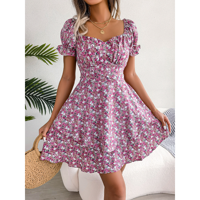 Women Mini Dress Temperament Big Swing Loose Hem Flower Print Shirring Dress Up Short Sleeves High Waist Summer Dress Clothes Red S