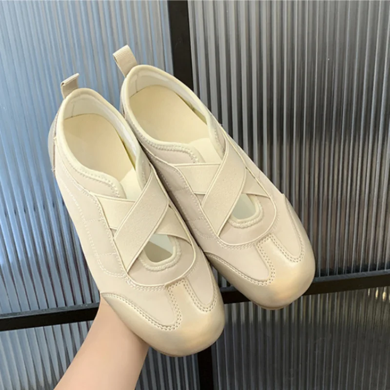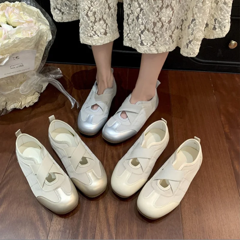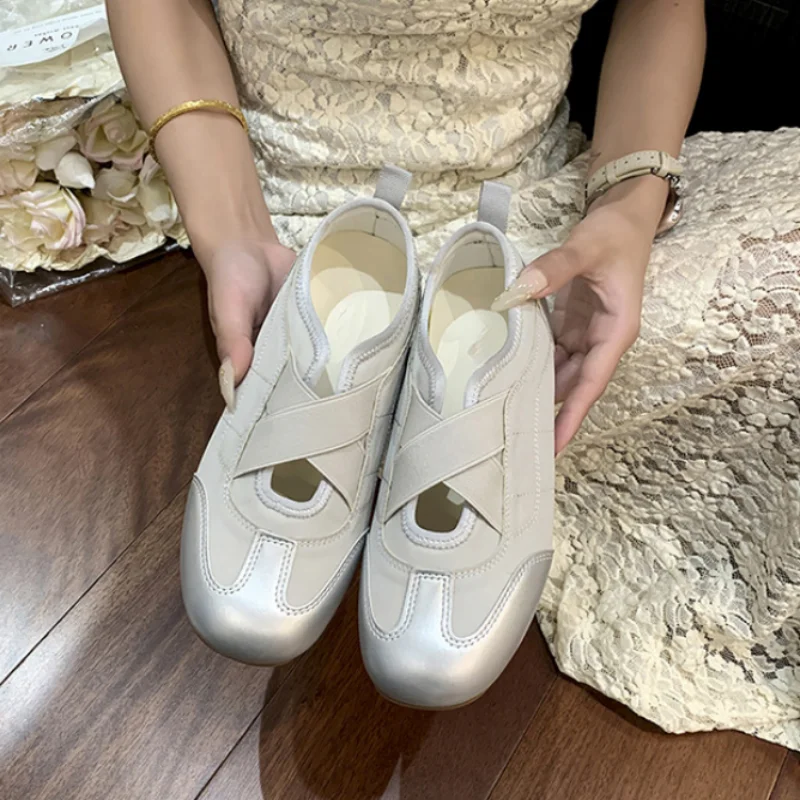 Ballet-Inspired Casual Flat Shoes with Crisscross Elastic Straps. Soft, lightweight sole ensures all-day comfort. Available in creamy white and silver, perfect for daily commuting, walking and shopping. A cute and comfortable addition to your shoe collection.