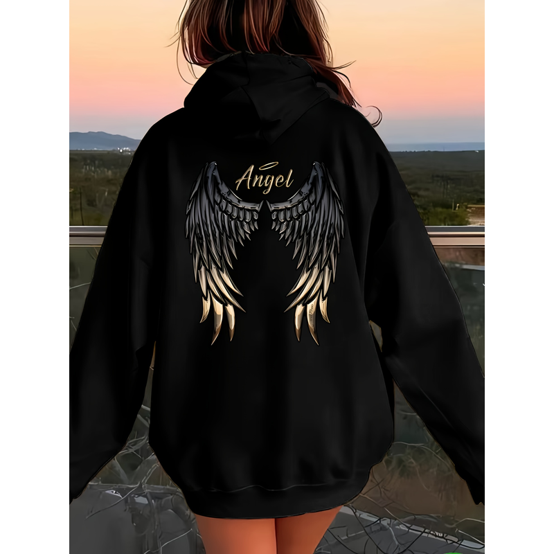 Women's Casual Hoodie with Angel Wings Graphic Drawstring Detail Kangaroo Pocket Perfect for Fall Winter Playful Design Trendy