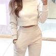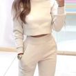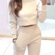 Women's Casual Turtleneck Solid Color Long-sleeved Sweater Trousers Suit Ivory White L