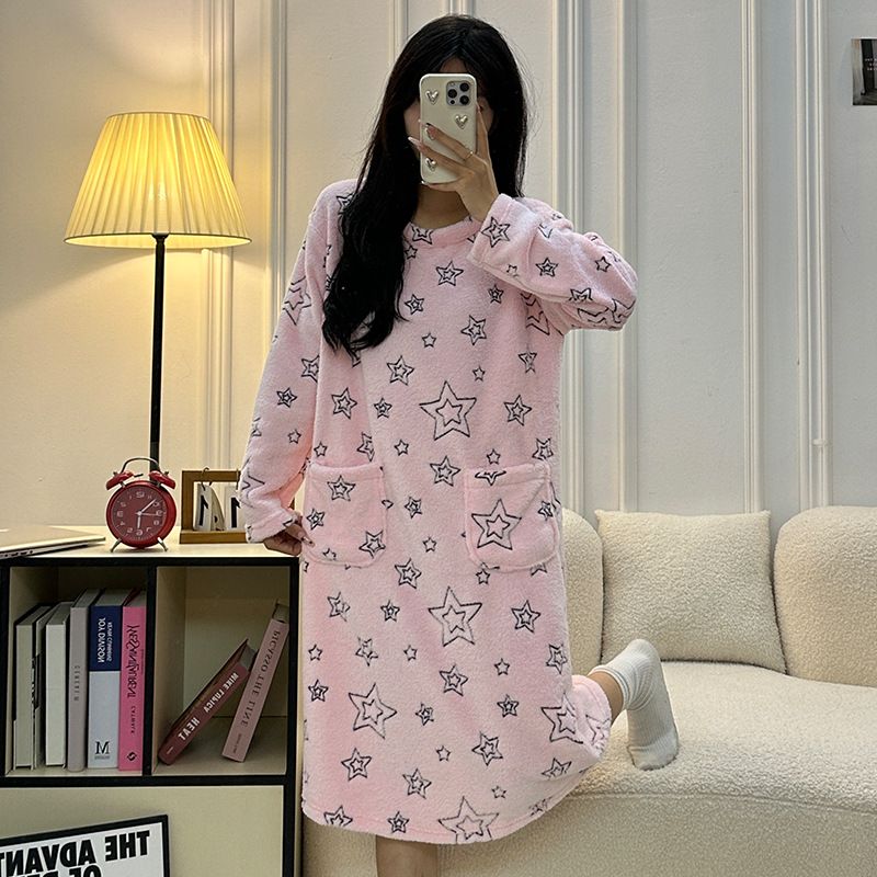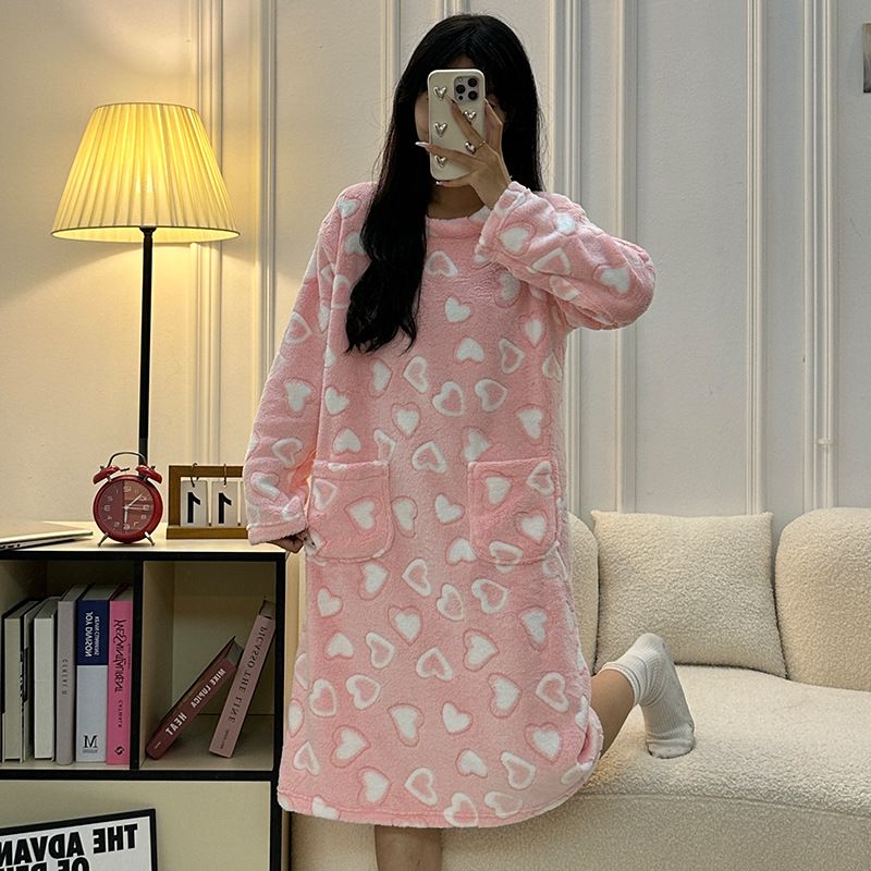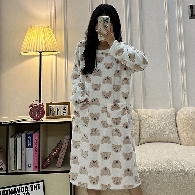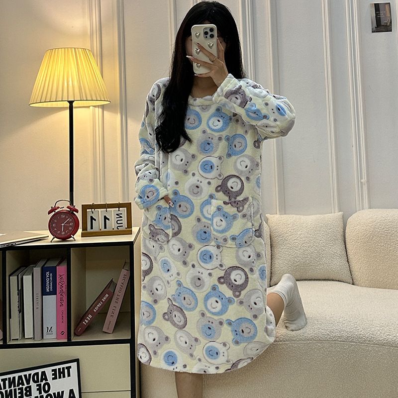 Women's Coral Fleece Pajamas Thickened Flannel Winter Sleepwear Home Comfortable Long Skirt Nightgown Cartoon Print Sleep Dress