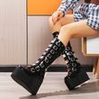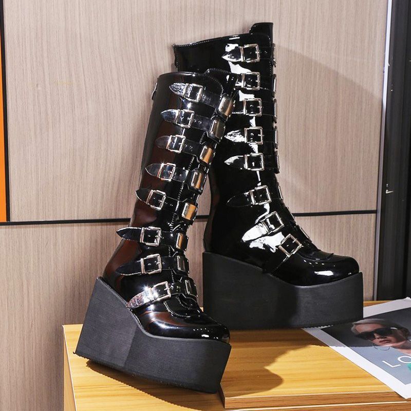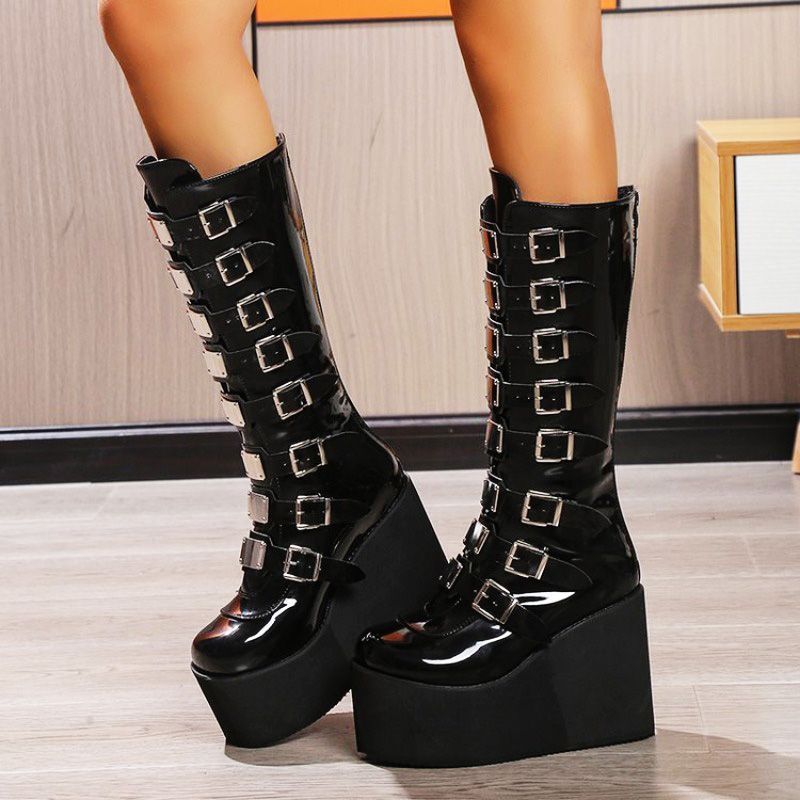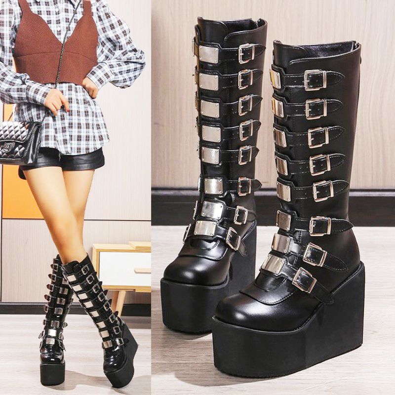 Women's Cosplay Boots Multi-row Belt Buckle Long Tube Leather Knight Boot Punk Gothic Classic Black High Heel Shoes Knee-High