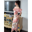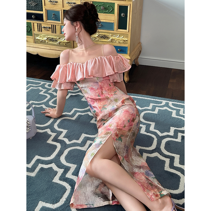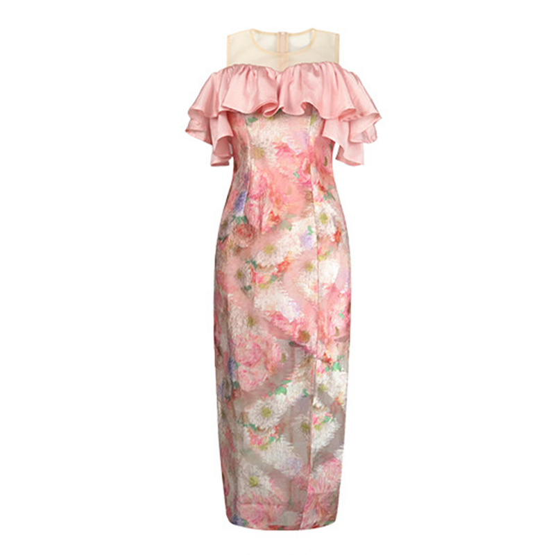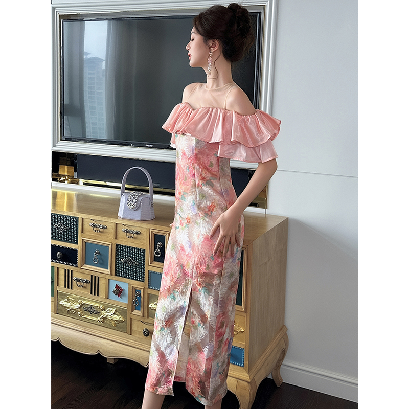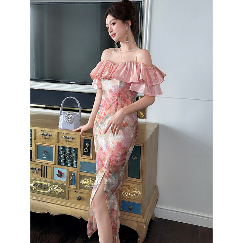 Women's Elegant Sexy Birthday Party Dress Kawaii Cute Sheer Mesh Splice Off Shoulder Ruffles Slit Robe Female Prom Date Vestidos