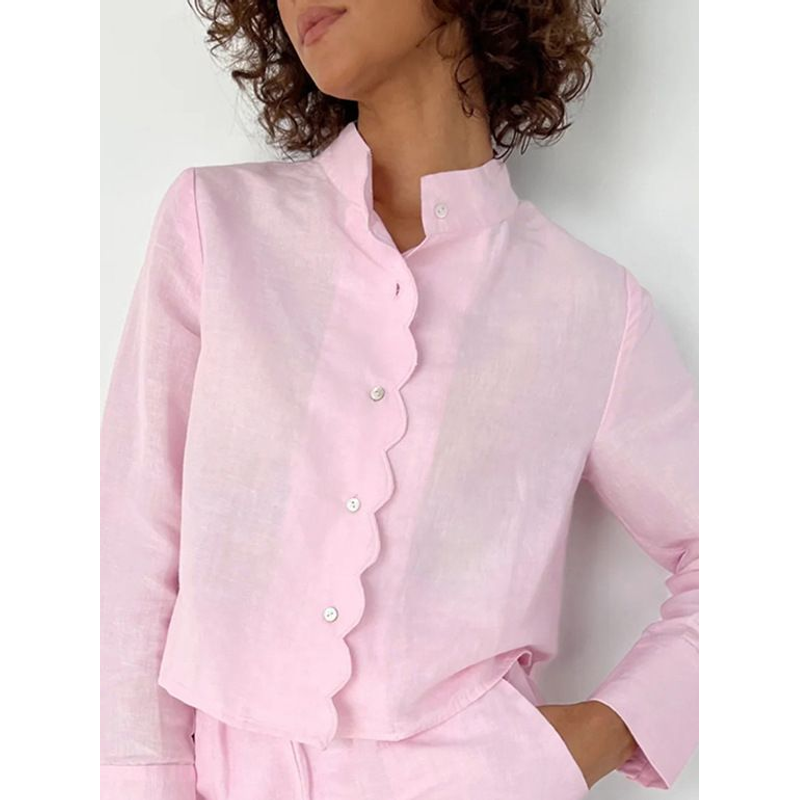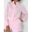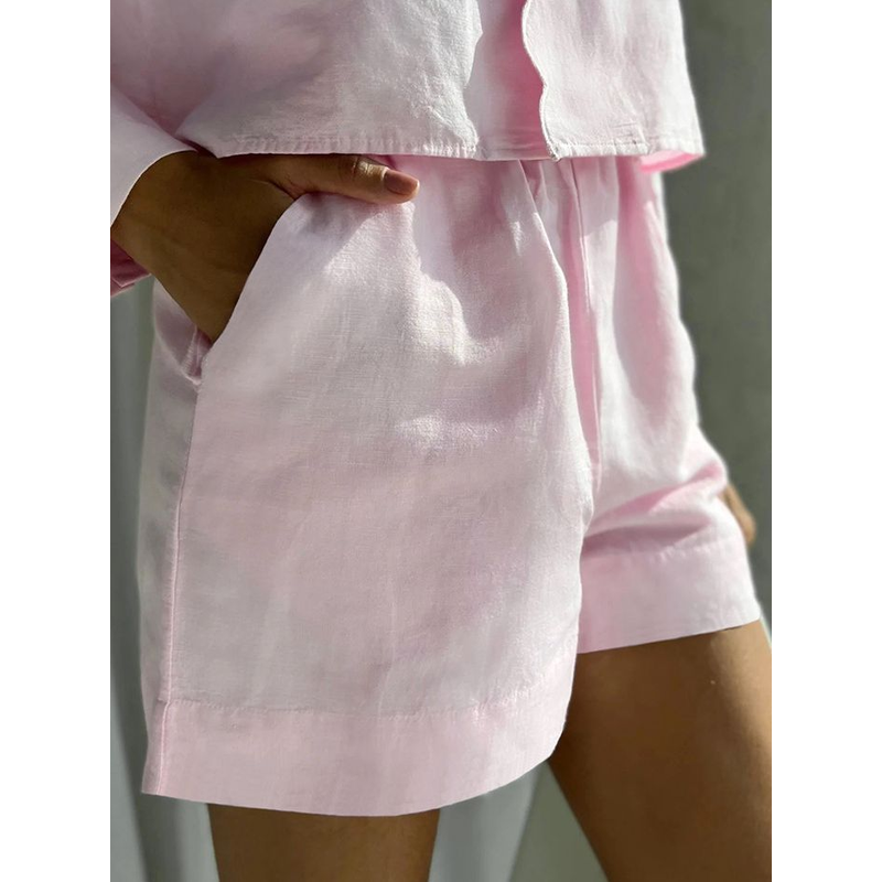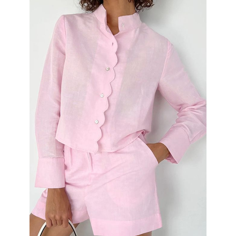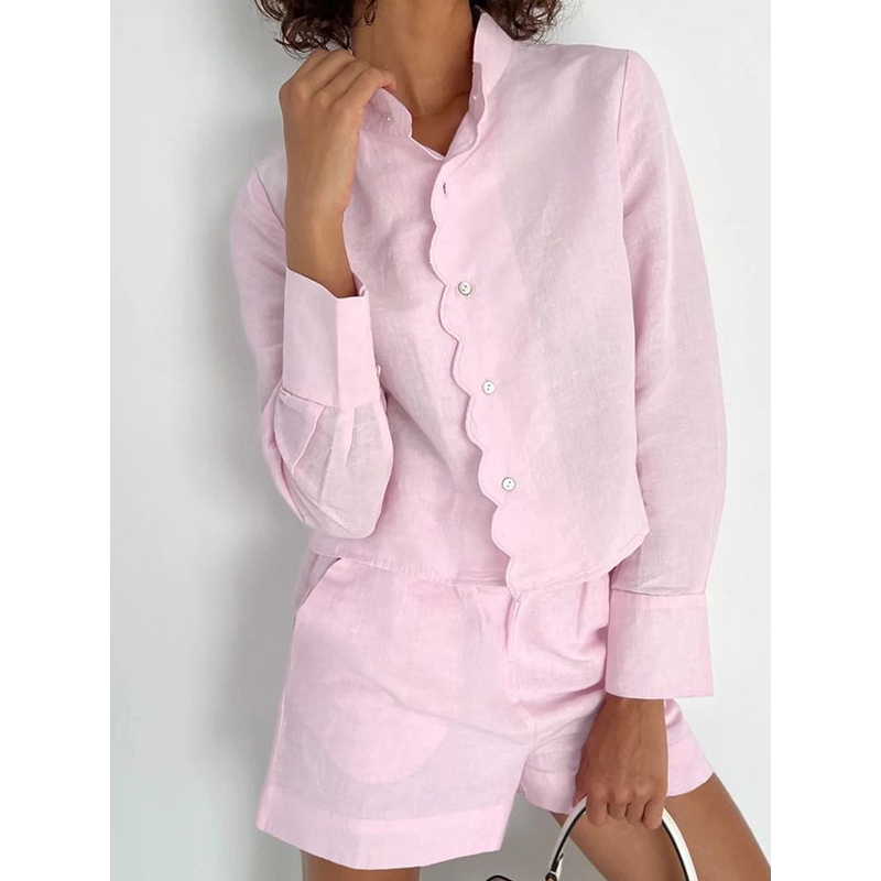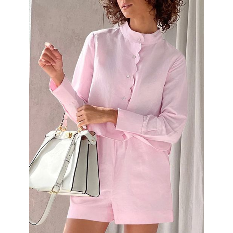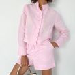 Women's Fashion Casual Long Sleeve Shirt High Waist Shorts Suit Pink S