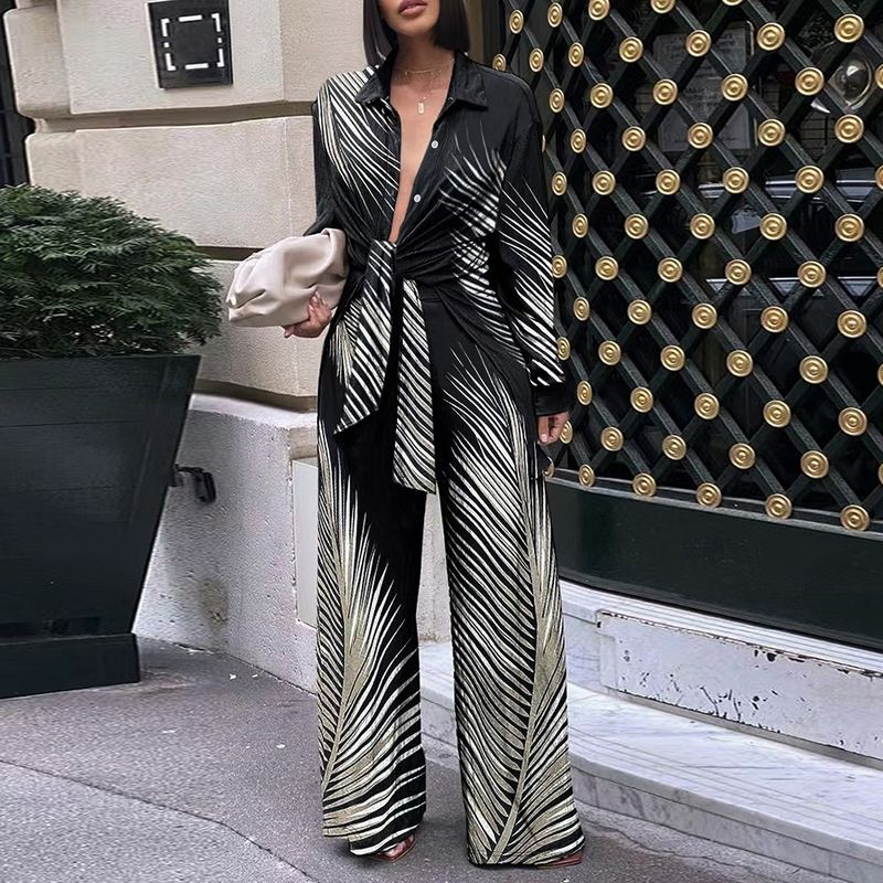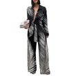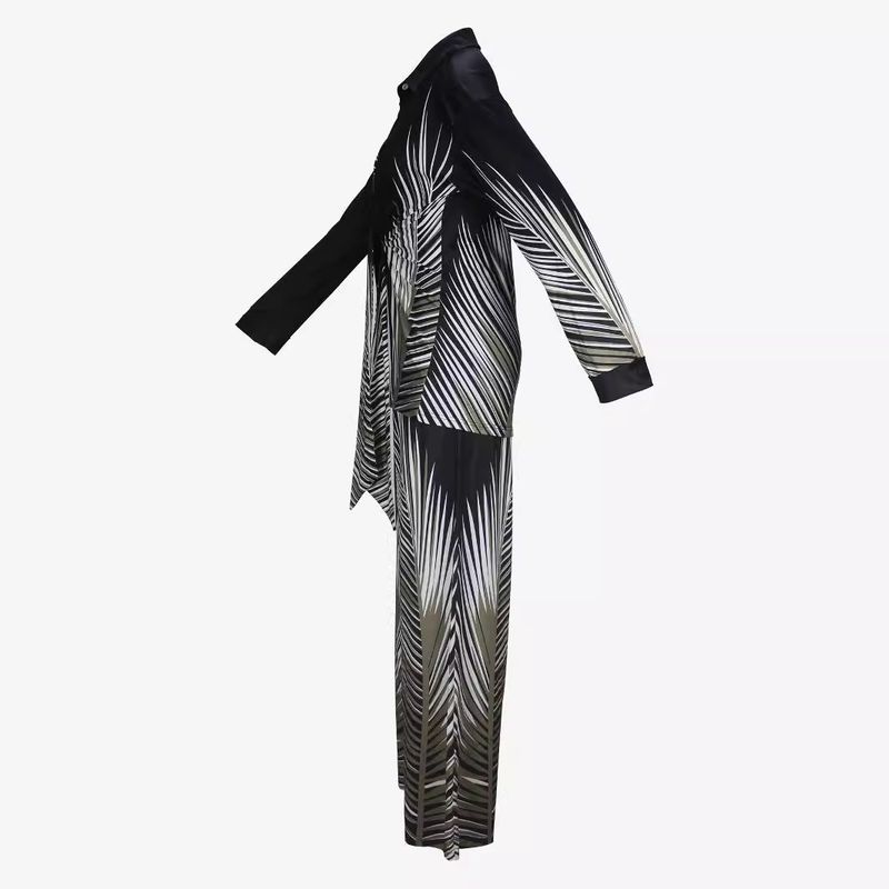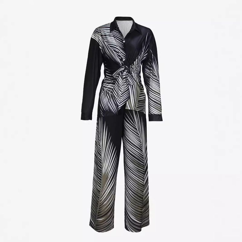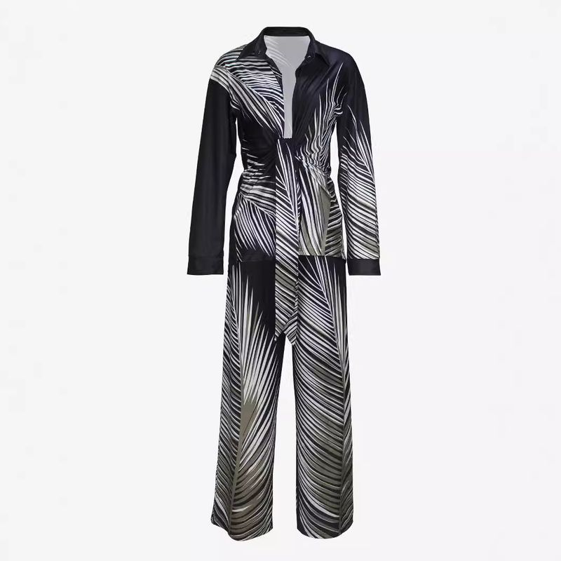 Women's Fashion Printed Long-sleeved Trousers Casual Shirt Two-piece Set Black And White S