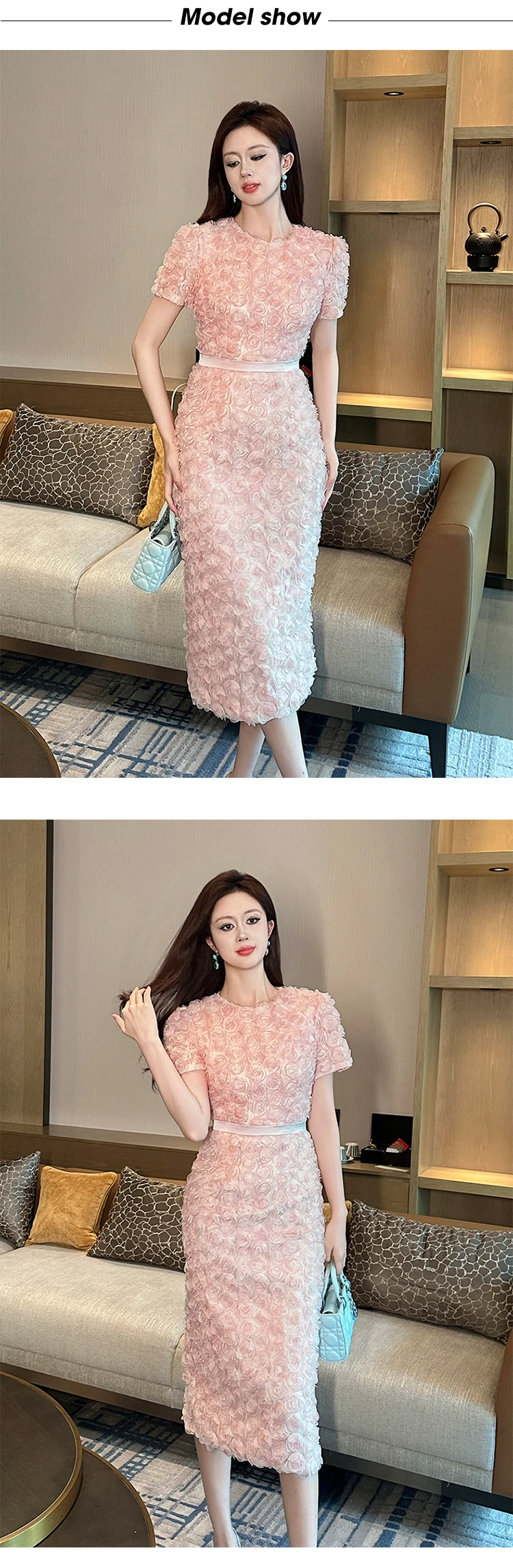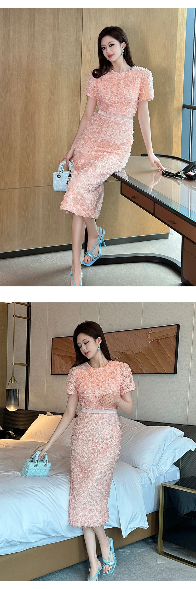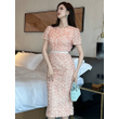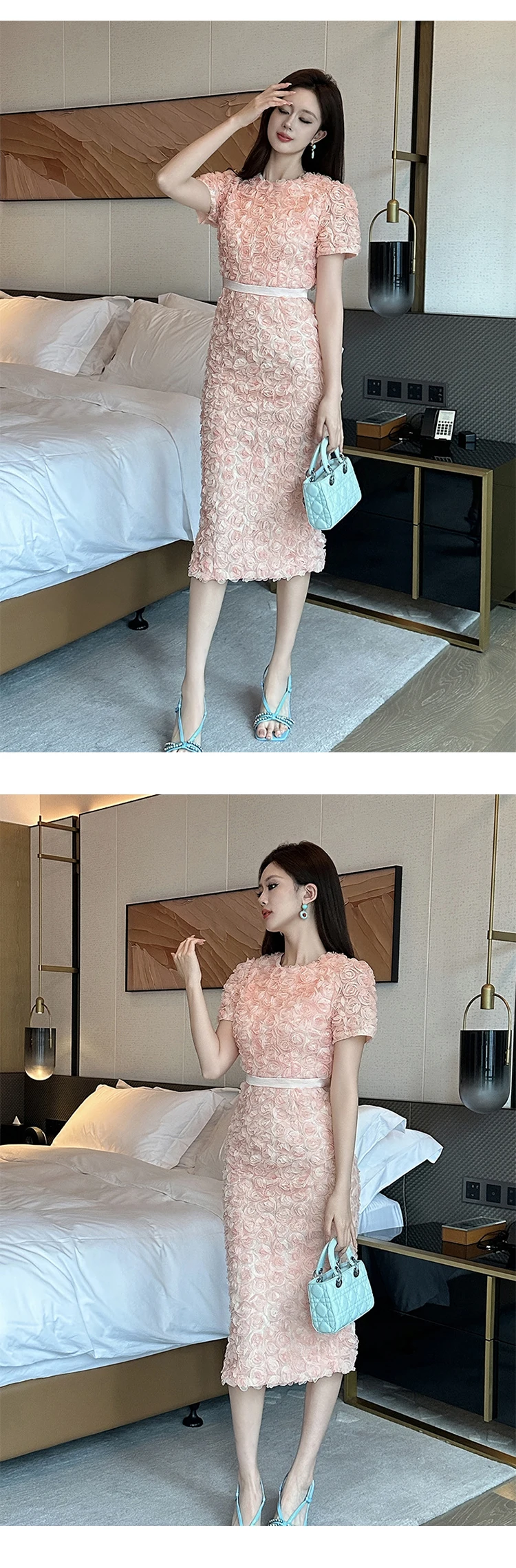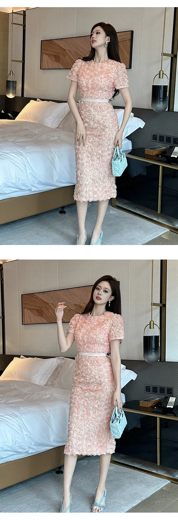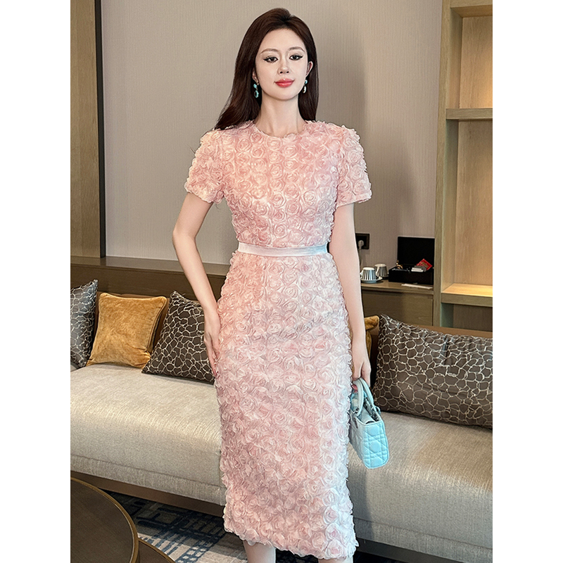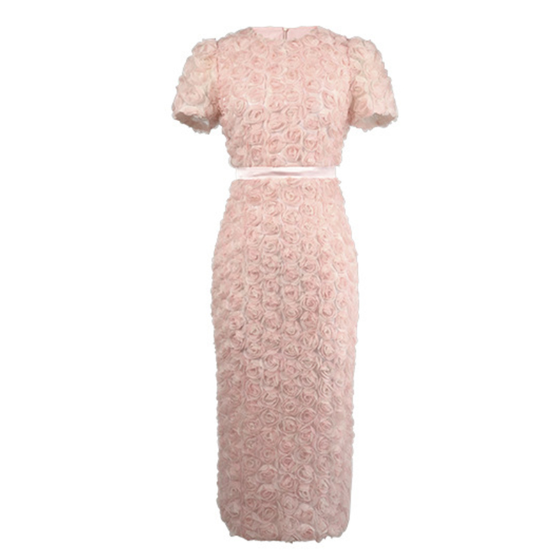Women's French Style Design Petal Bubble Sleeve Pink Dress for Woman Elegant Midi Robe Female Birthday Party Prom Vestidos