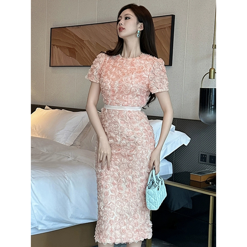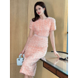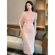 Women's French Style Design Petal Bubble Sleeve Pink Dress for Woman Elegant Midi Robe Female Birthday Party Prom Vestidos