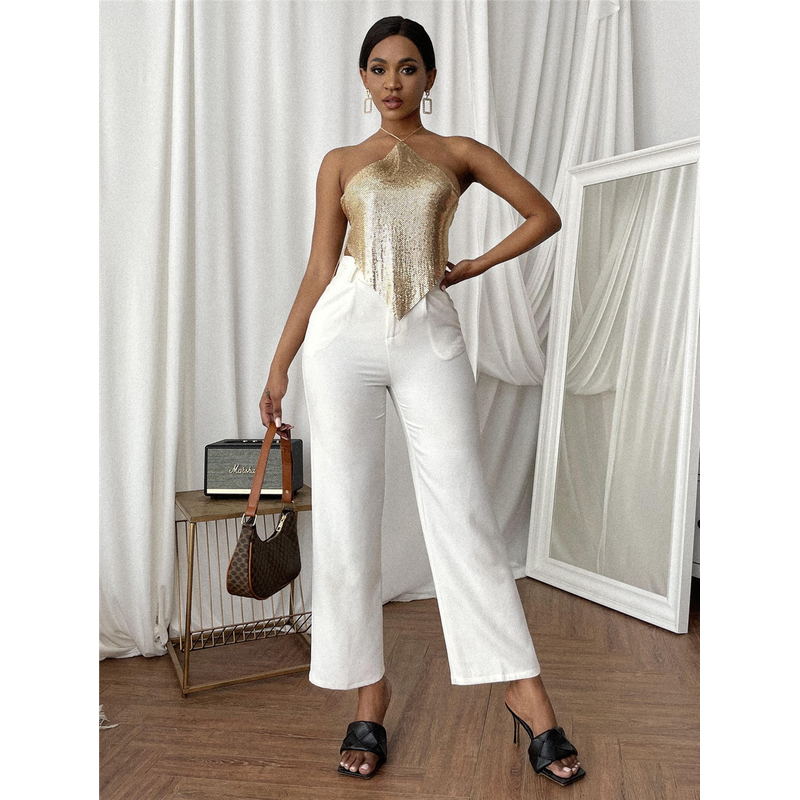 Women's Halter Sequined Metal Top Gold S