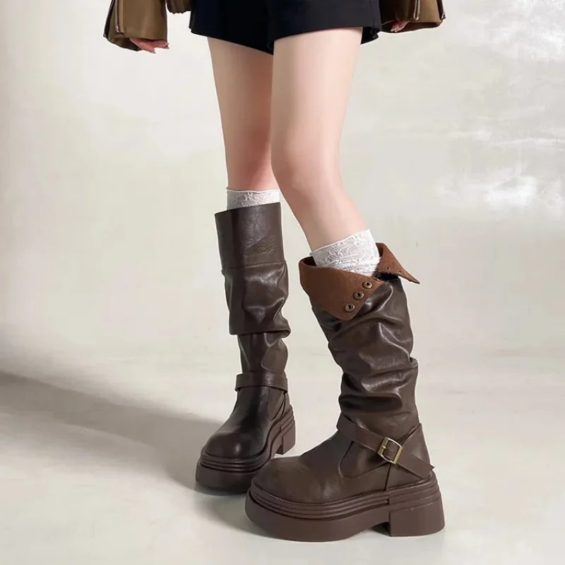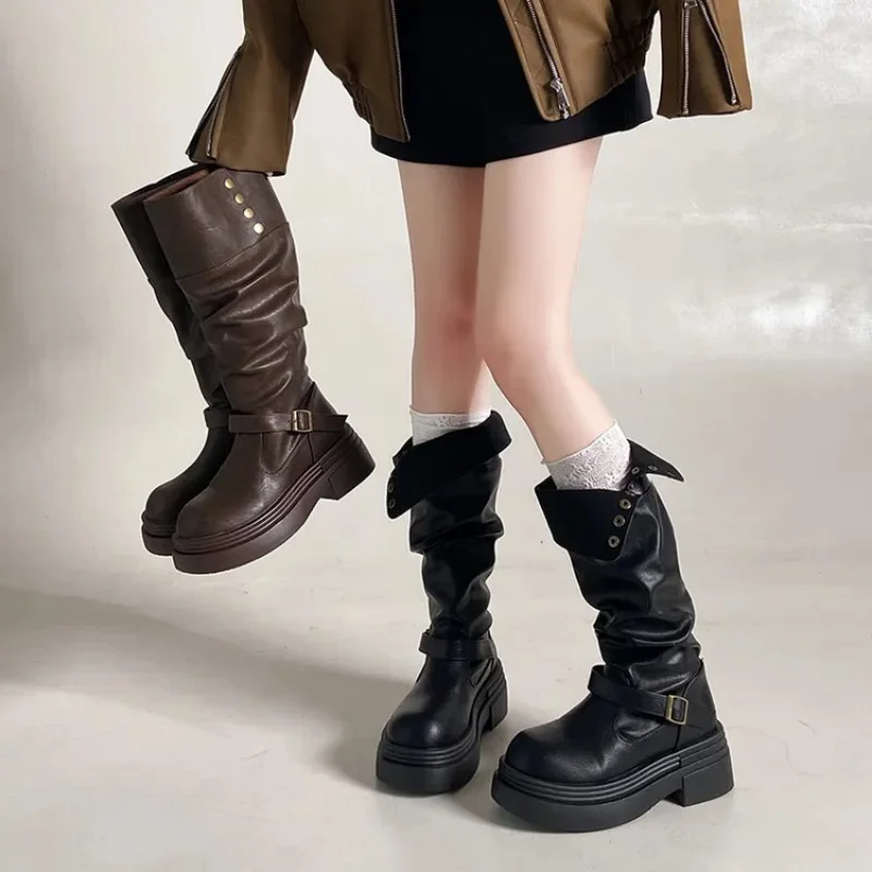 Foldable shaft unlocks two wearing styles: folded to reveal inner details for layered look; unfolded for lazy rider-boot vibe. Metal buckles at the cuff enhance motorcycle style, upgrading from “basic” to “eye-catcher”, standing out in crowds.