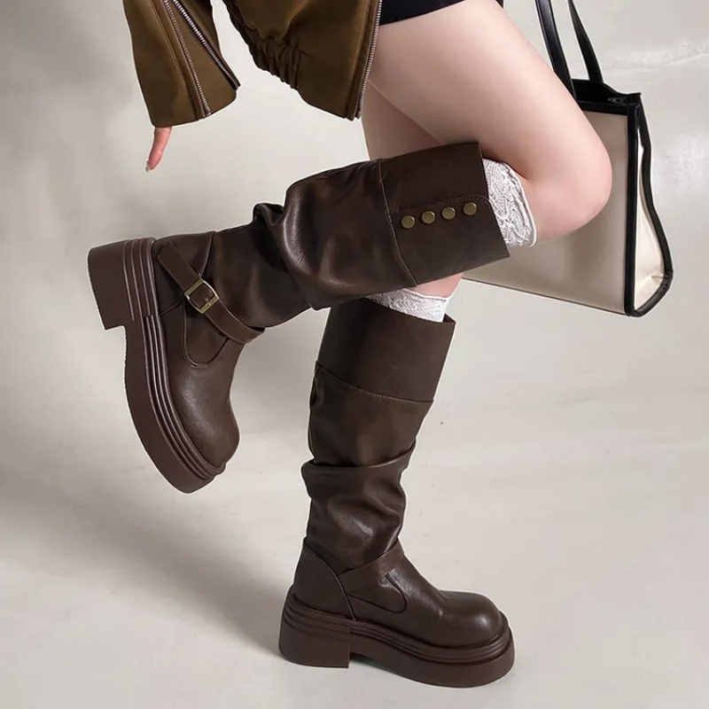 Women's High Knee Boots, Chunky Platform Stacked Rider Boots, Spring/Autumn Two-Way Edgy Fold-Over Cuff Fashion Design