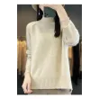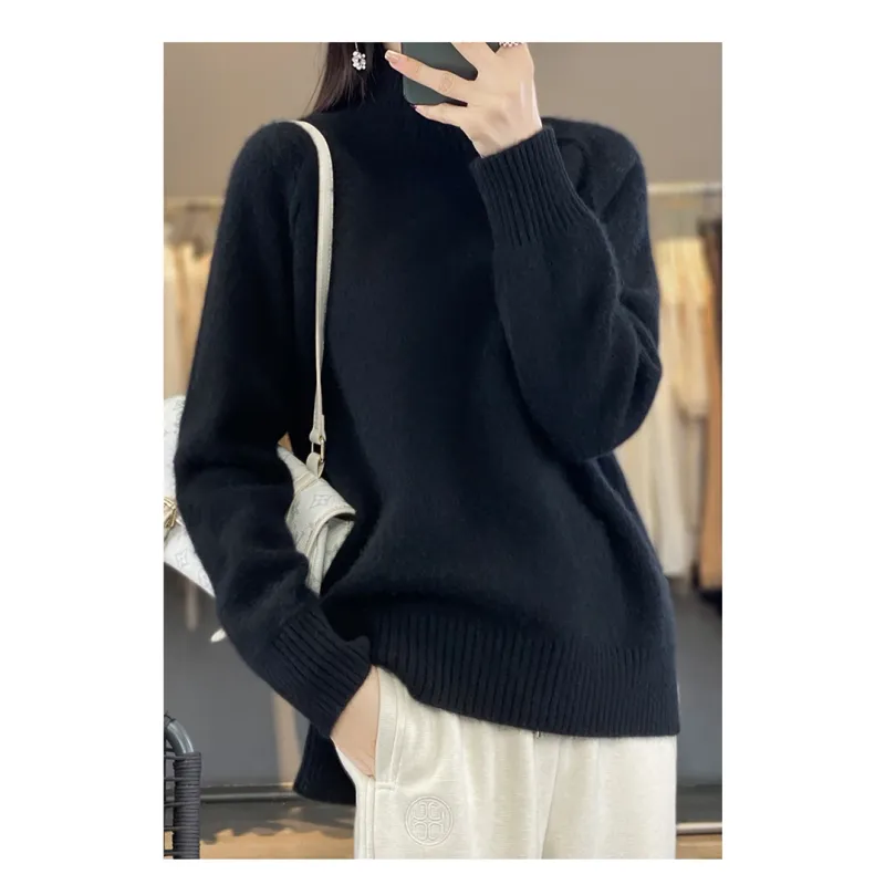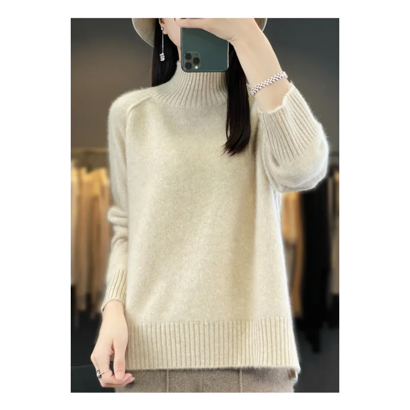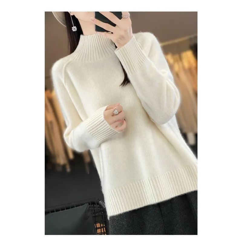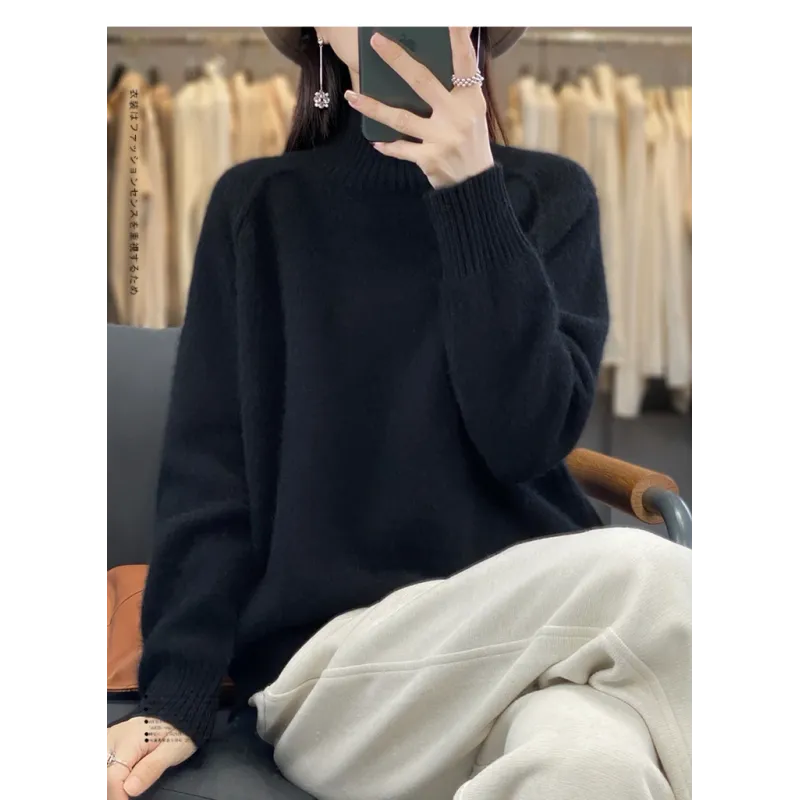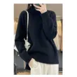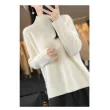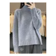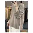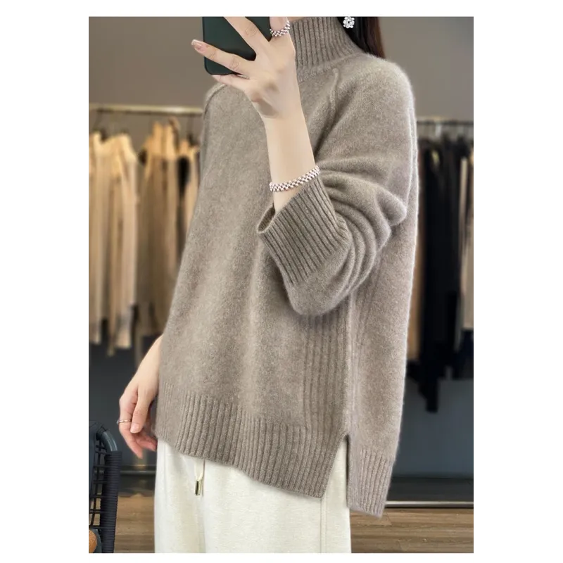 Women's High-Necked Cashmere Sweater 100% Soft Wool Thickened Lazy Raglan Sweater with Slit for Autumn Winter Comfortable Waxy W