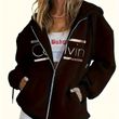 Women's Hoodie - Cozy Brown Zip-Up with White Print Casual Long Sleeve Sweatshirt Drop Shoulder Design Relaxed Fit Winter W
