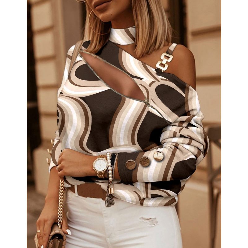 Women's Long-sleeved Chain On Neck Printed Top Khaki XXL