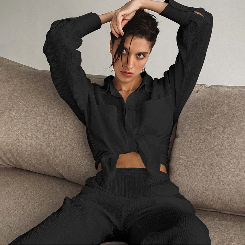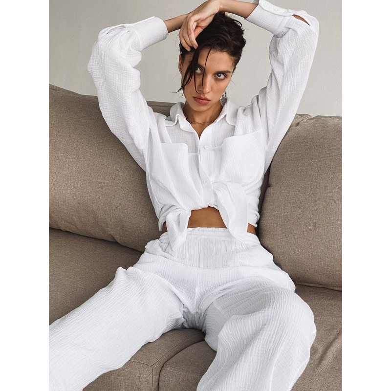 Women's Loose Casual Long Sleeves Shirt High Waist Straight Pants Suit Purple M