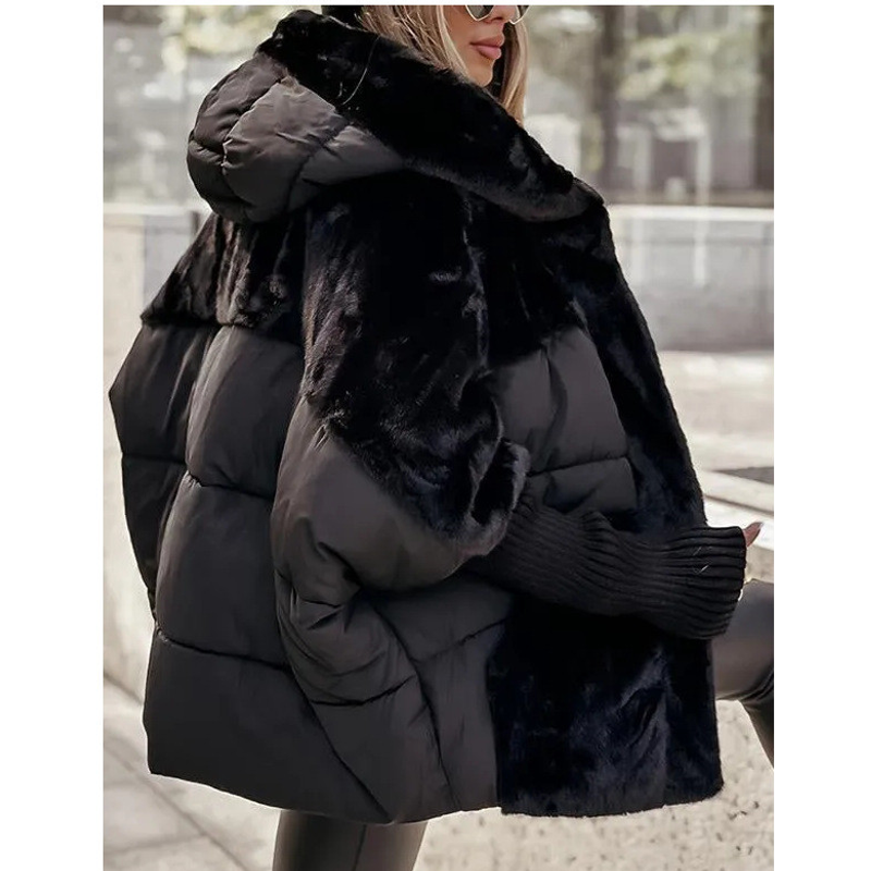 Women's Loose Cotton Coat Faux Fur Patchwork Winter Coat Comfort Chic Long Sleeve Hooded Jacket Deep Khaki XXXL