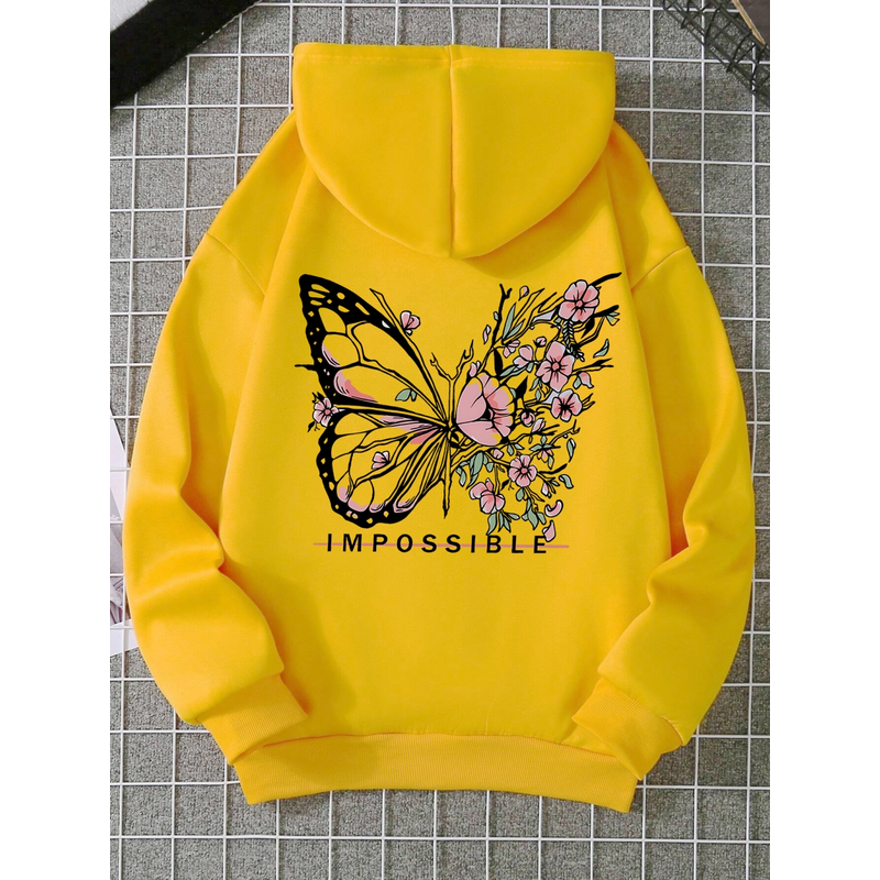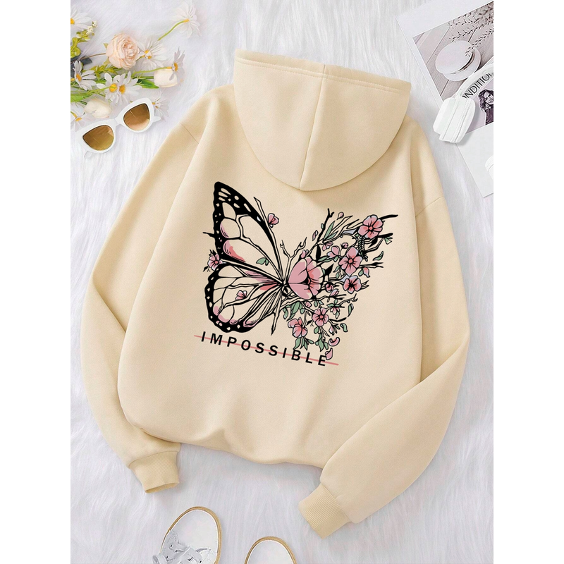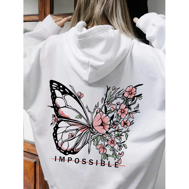 Women's Pink Butterfly Impossible Letters Pattern Printed Sweatshirt Fashion Warm Hoodie Loose Casual Hoodie Soft Clothing Y2K