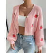 Women's Pink Strawberry Embroidered Button Front Crop Knit Cardigan Casual Long Sleeve Slim Fit Outerwear