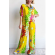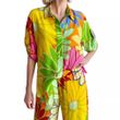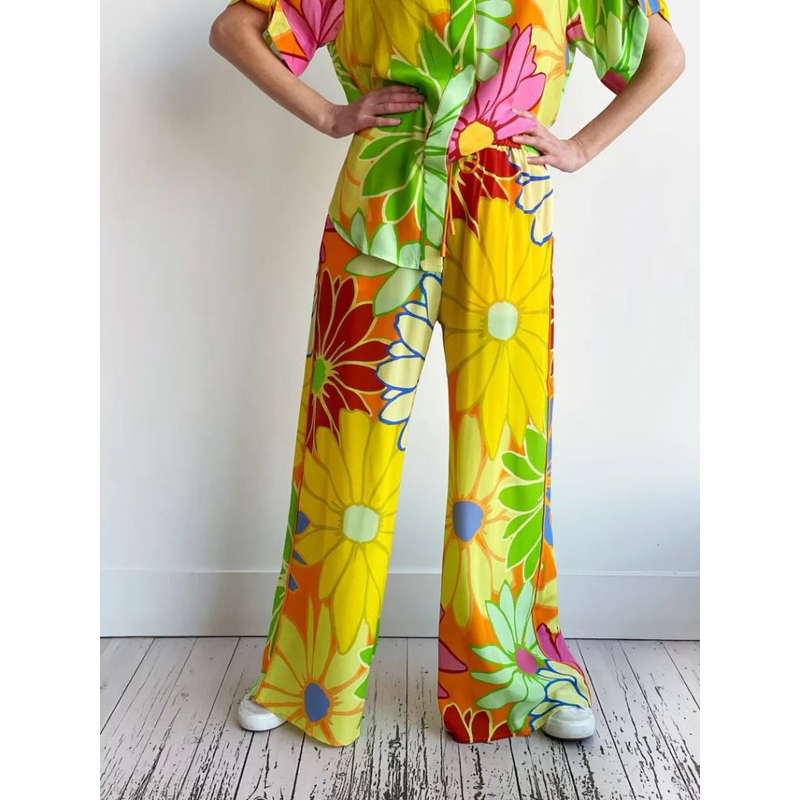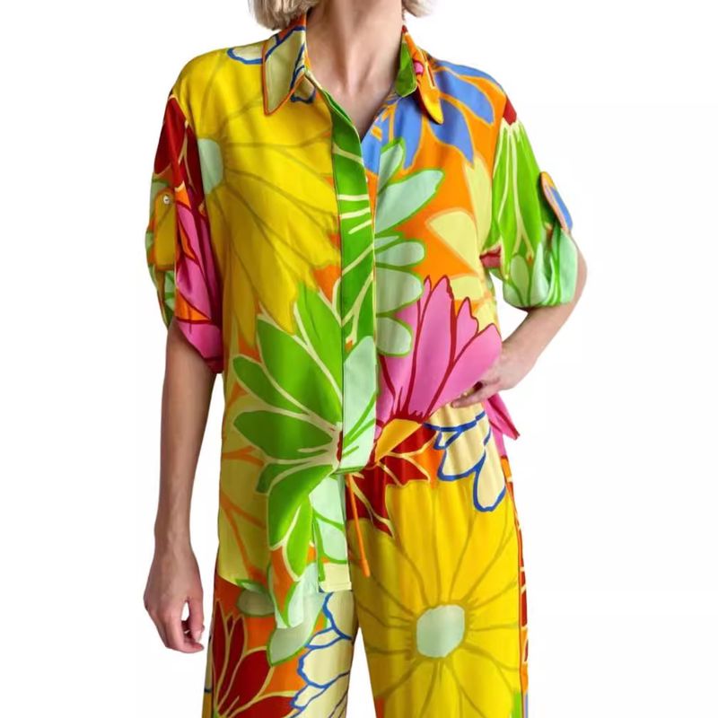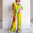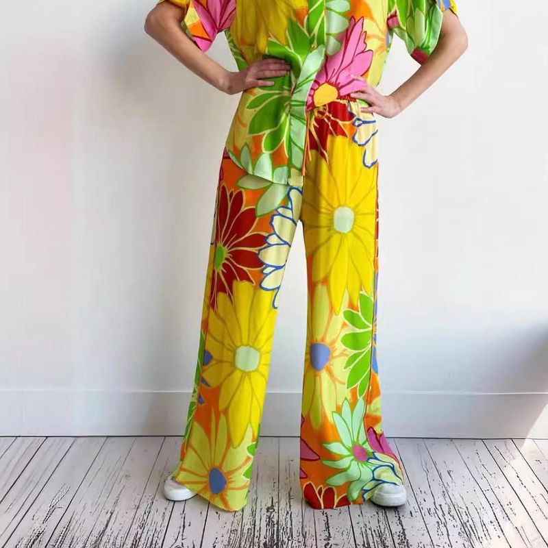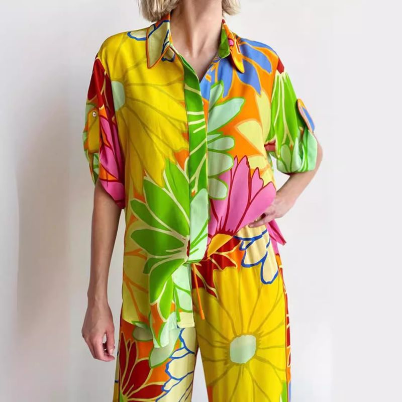 Women's Printed Loose Short Sleeve Shirt Pocket Trousers Suit Floral Pants 2XL