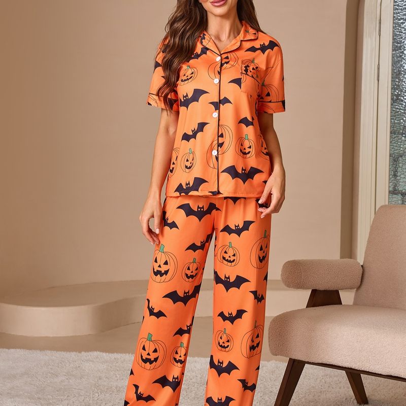 Women's Printed Pajamas Suit Fashionable Short-sleeved Shirt And Trousers Orange XL