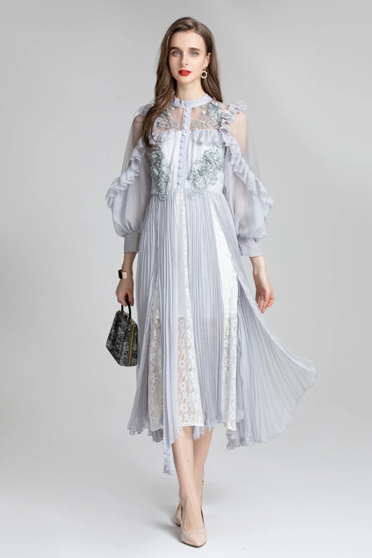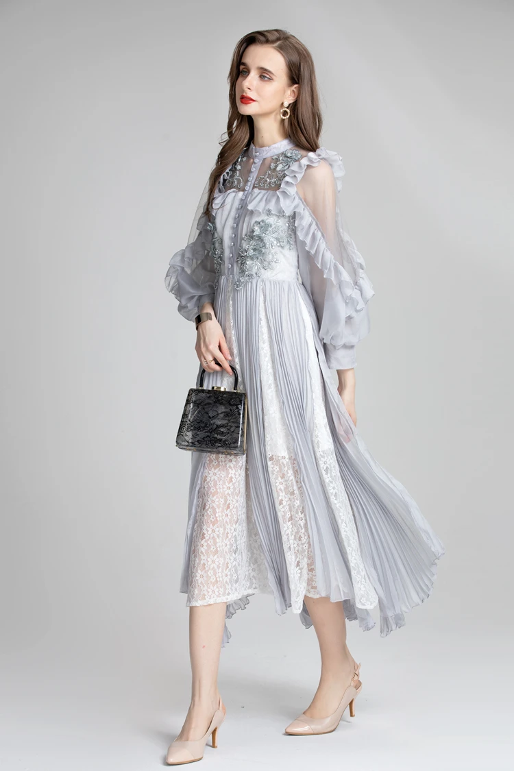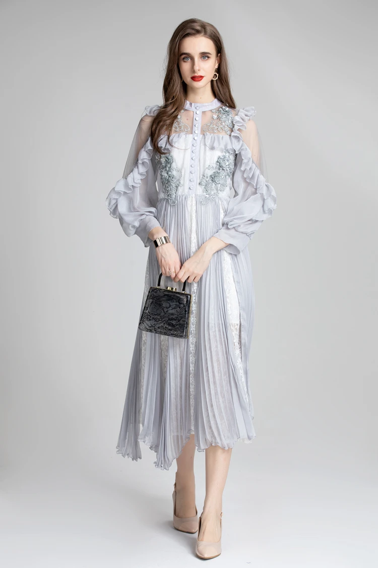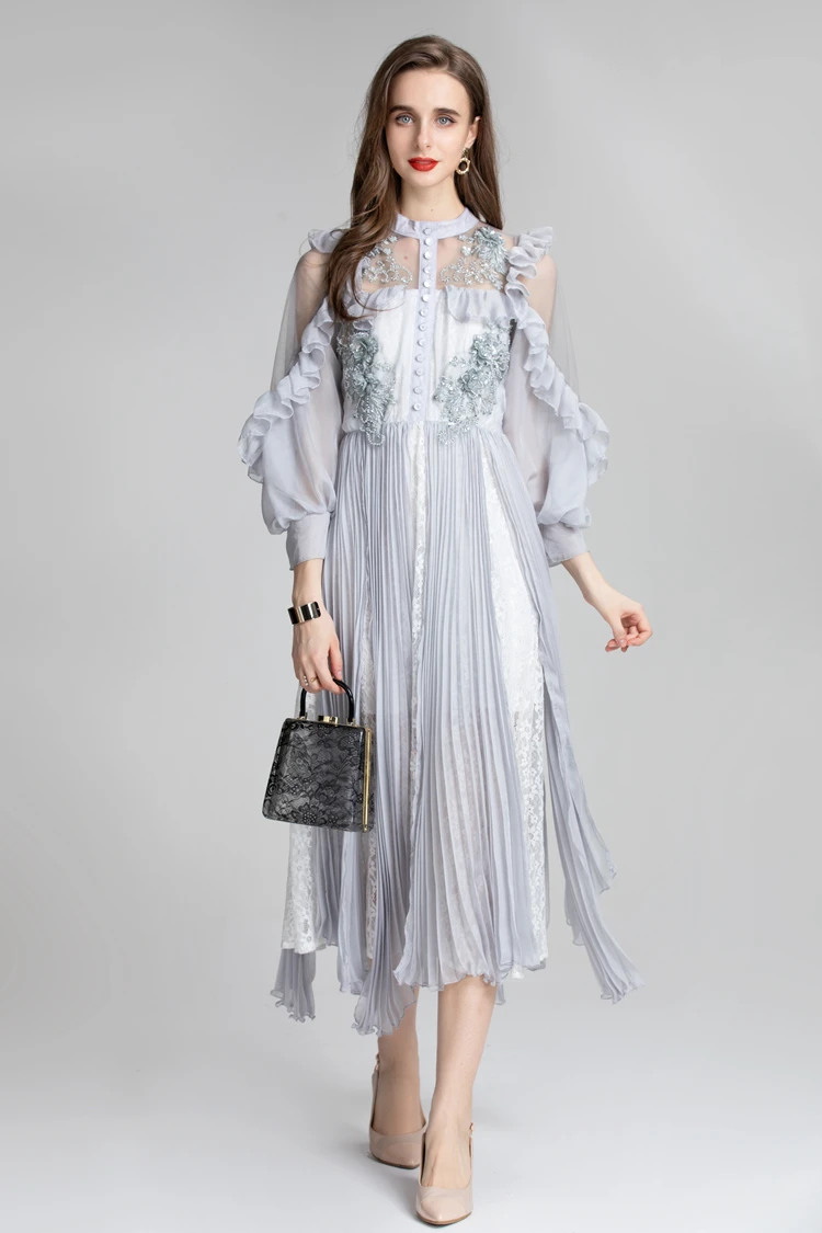 Women's Runway Dresses O Neck Long Sleeves Ruffles Beaded Embroidery Sexy Tulle Laid Over Elegant Party Prom