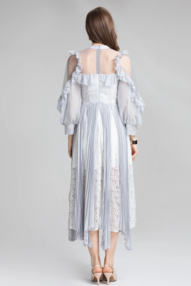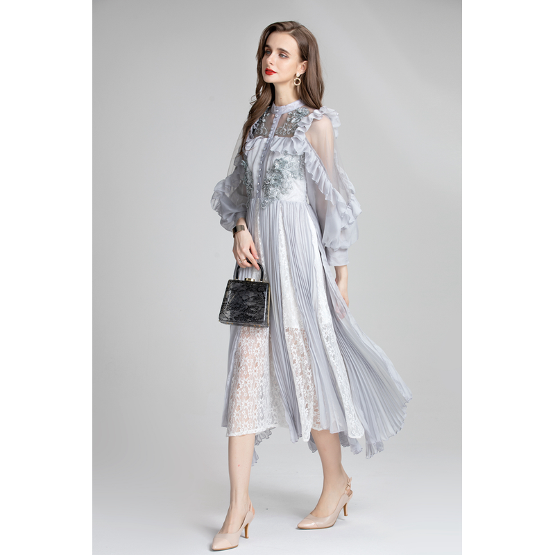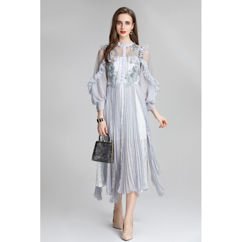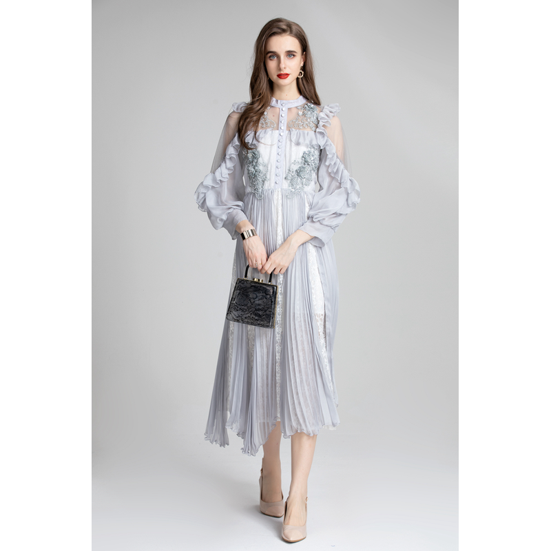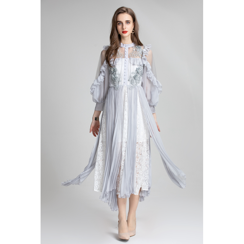 Women's Runway Dresses O Neck Long Sleeves Ruffles Beaded Embroidery Sexy Tulle Laid Over Elegant Party Prom