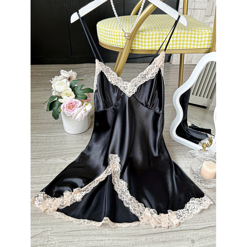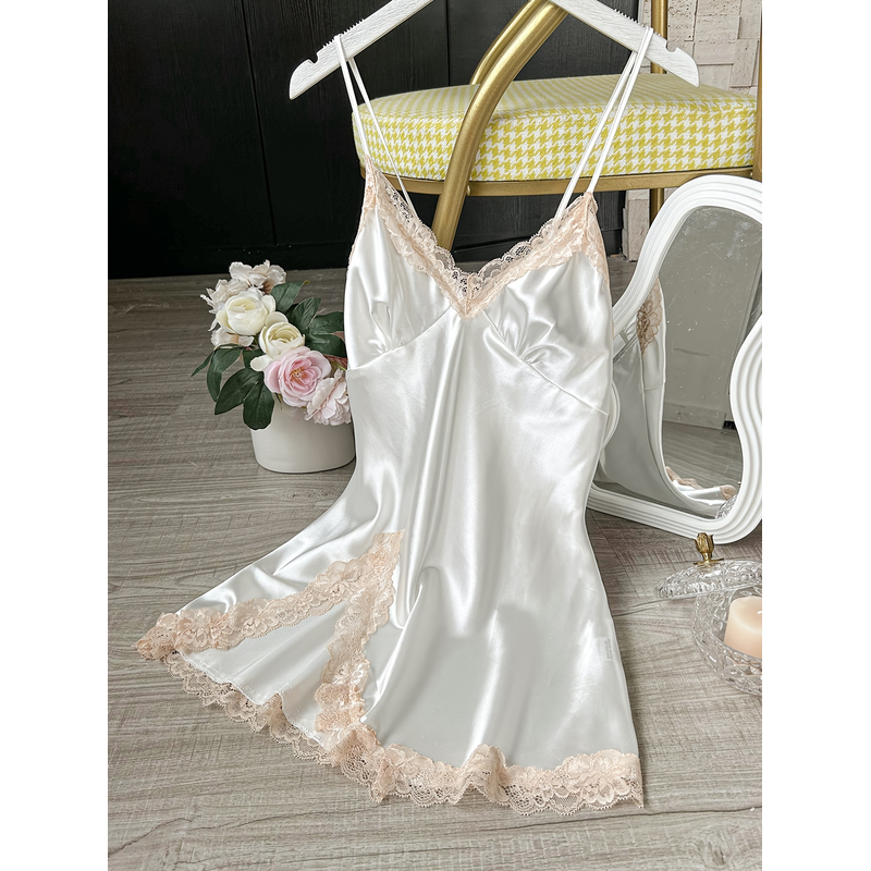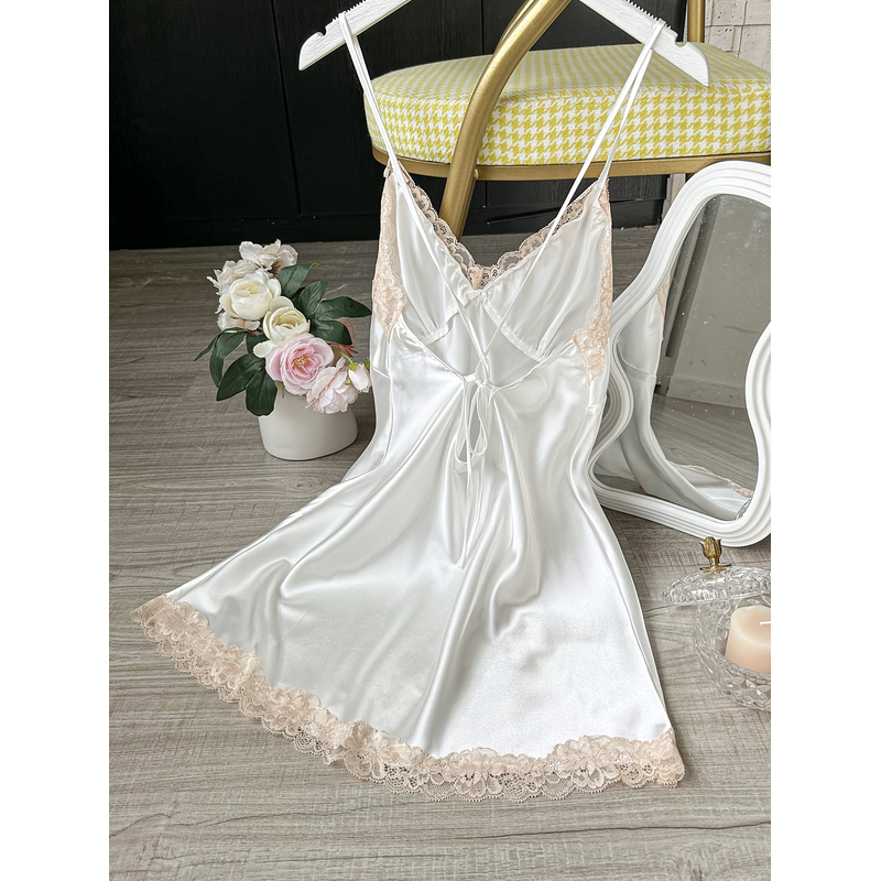 Women's Satin V-Neck Lace Trim Chemise 1-Pc Sexy Mini Nightdress