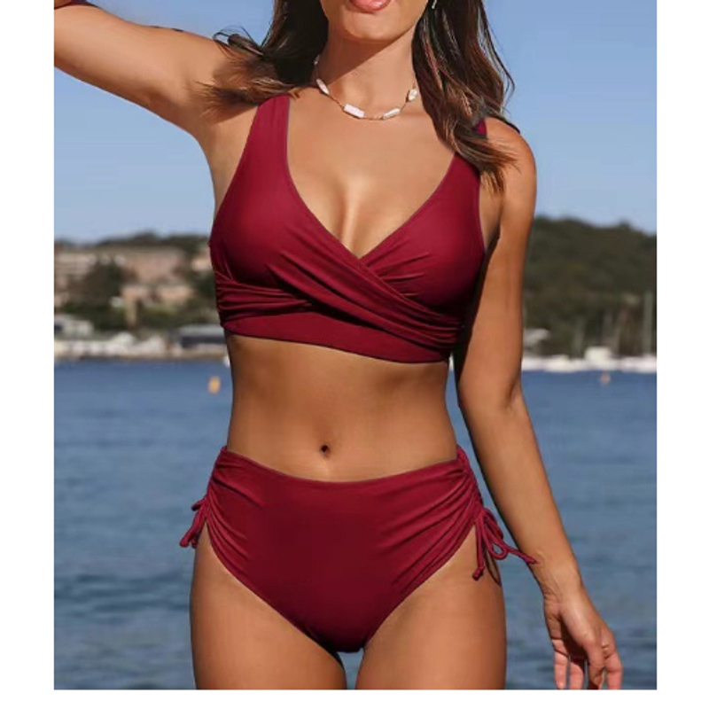 Women's Seaside Swimwear Cross Strap Solid Color Split Swimsuit Bikini Brick red L