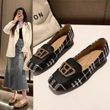 Women's slip-on loafers with a square toe, plaid color blocking, and metal buckle decoration. Featuring stylish low chunky heels and a versatile design, the soft and comfortable outsole makes them perfect for commuting and casual wear.