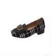 Women's slip-on loafers with a square toe, plaid color blocking, and metal buckle decoration. Featuring stylish low chunky heels and a versatile design, the soft and comfortable outsole makes them perfect for commuting and casual wear.