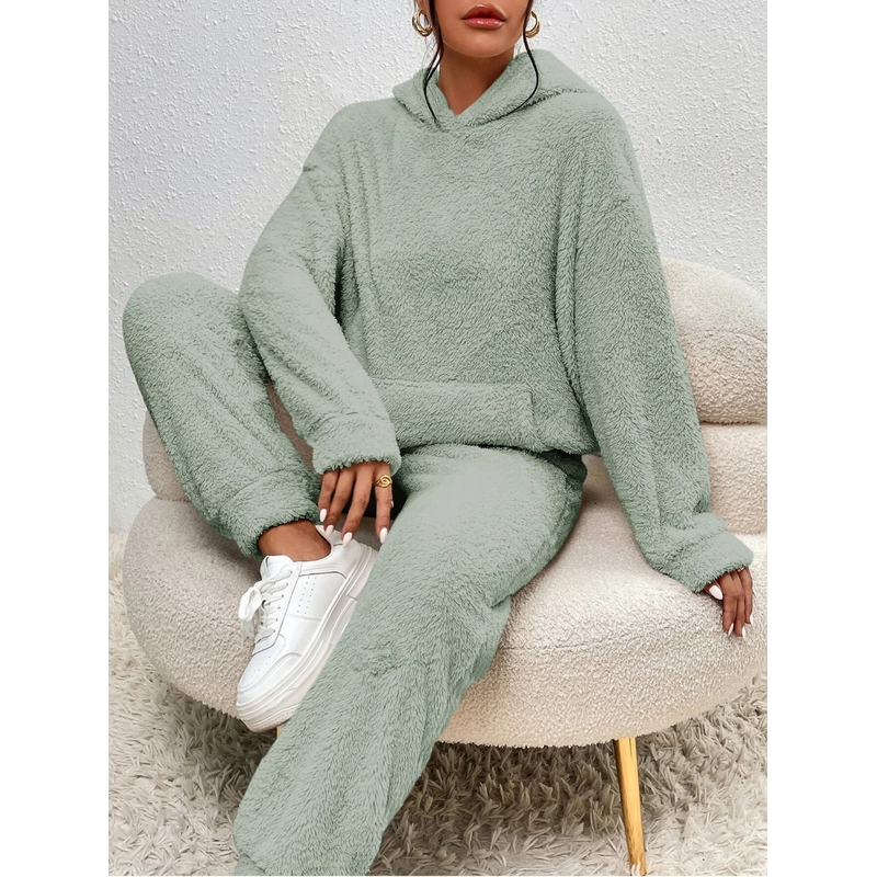 Women's Solid Color Plush Hooded Long Sleeve Trousers Suit Green 5XL