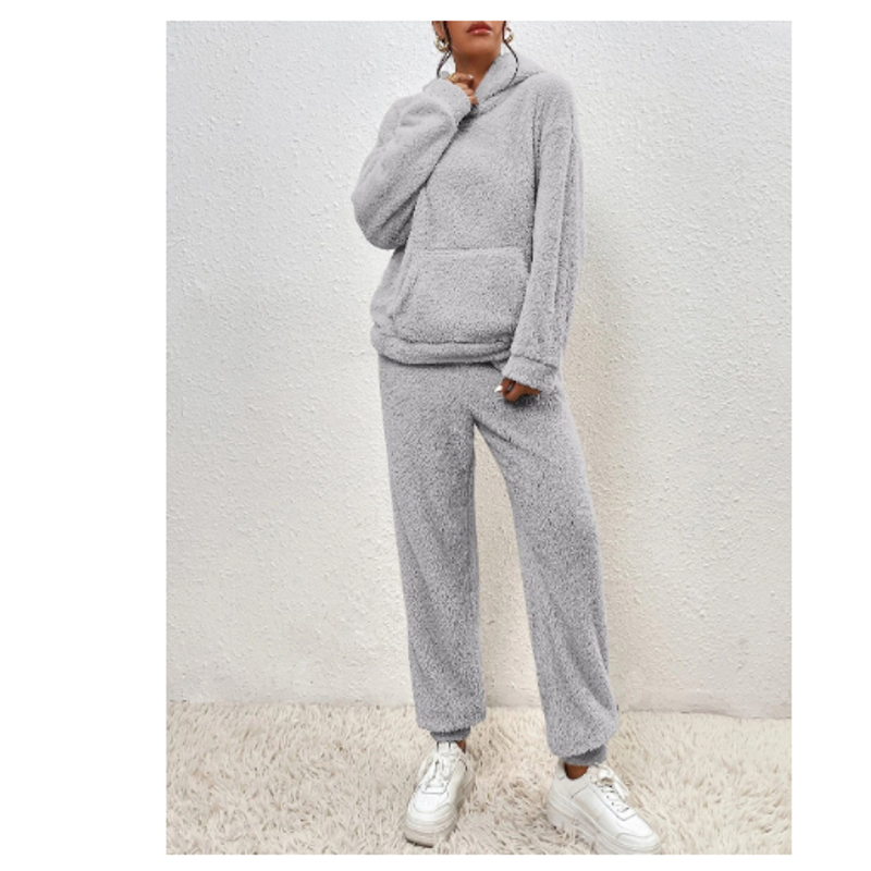 Women's Solid Color Plush Hooded Long Sleeve Trousers Suit Grey 2XL