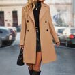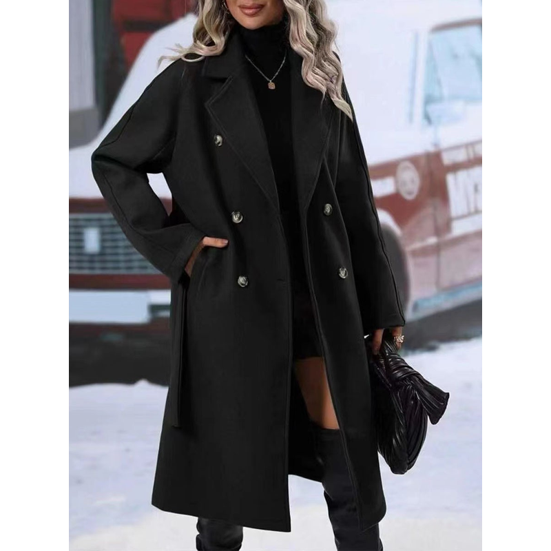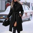 Women's Solid Color Polo Collar Lace Up Double Breasted Long Trench Coat Black 3XL