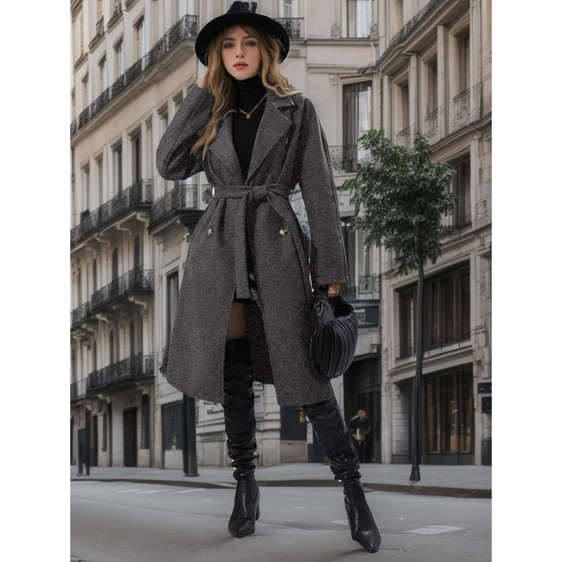 Women's Solid Color Polo Collar Lace Up Double Breasted Long Trench Coat Gray L