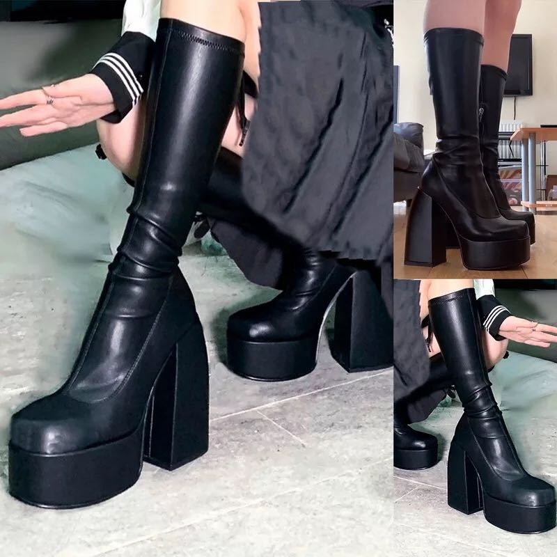 Women's Square Toe High Heeled Boots Long Short Tube Block Heel Boots Women Platform Shoes Black Cowboy Boots for Women