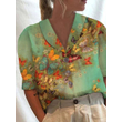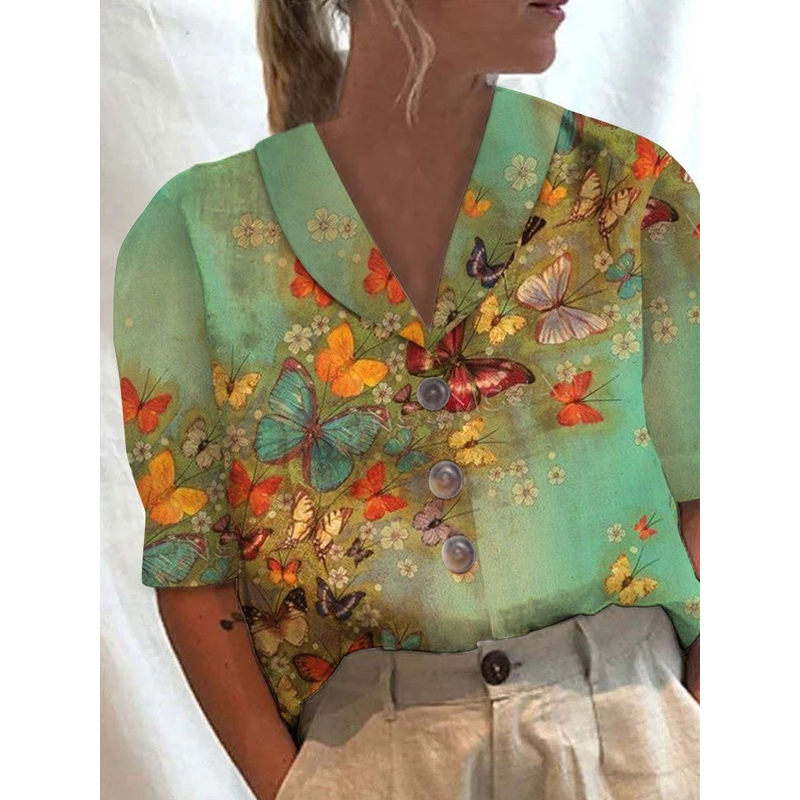 Women's Stand Collar Button Casual Half-sleeve Cotton And Linen Printed Short-sleeved Shirt 12 Color 2XL