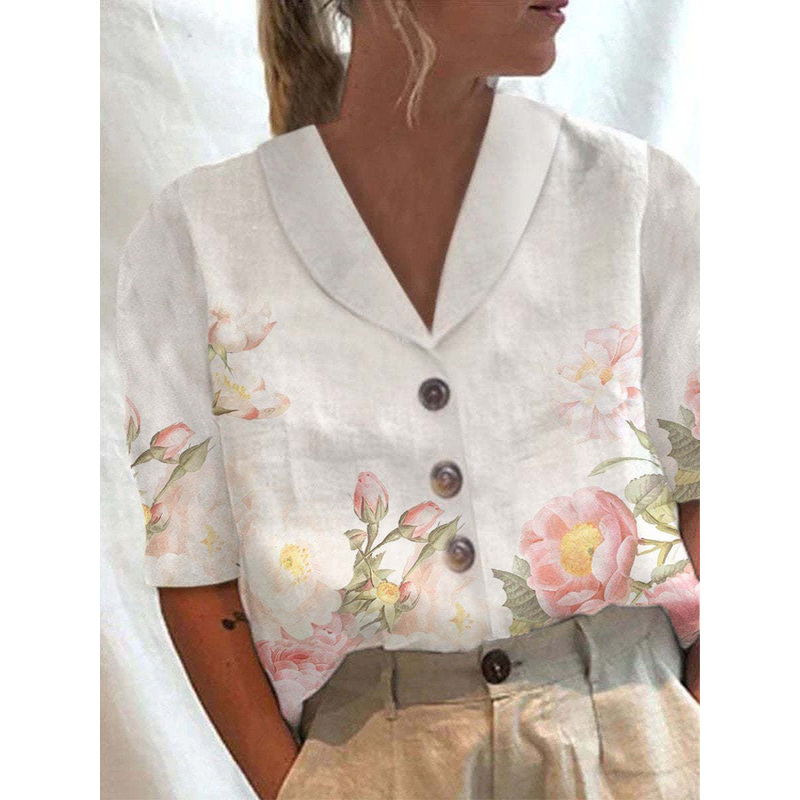 Women's Stand Collar Button Casual Half-sleeve Cotton And Linen Printed Short-sleeved Shirt 6 Color L