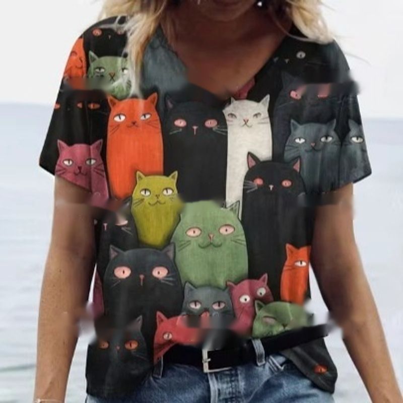 Women's Summer Cat Print Casual Short Sleeve Round Shirt Loose Clothing 2style 2XL
