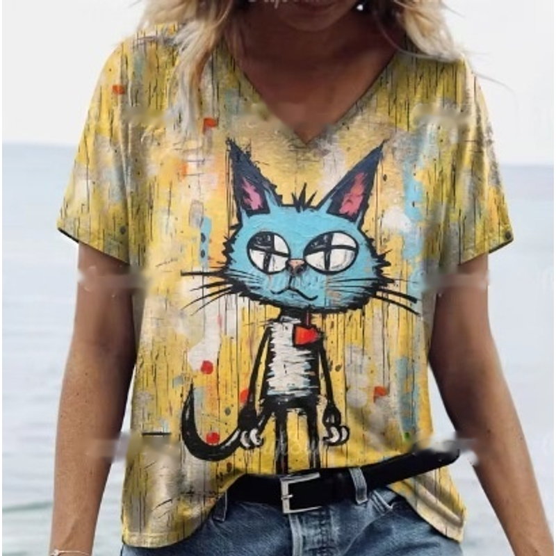 Women's Summer Cat Print Casual Short Sleeve Round Shirt Loose Clothing 7style 2XL