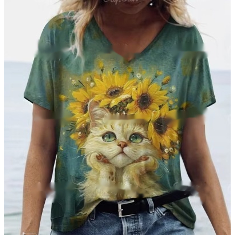 Women's Summer Cat Print Casual Short Sleeve Round Shirt Loose Clothing 9style 2XL
