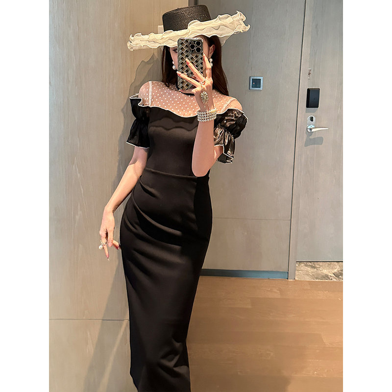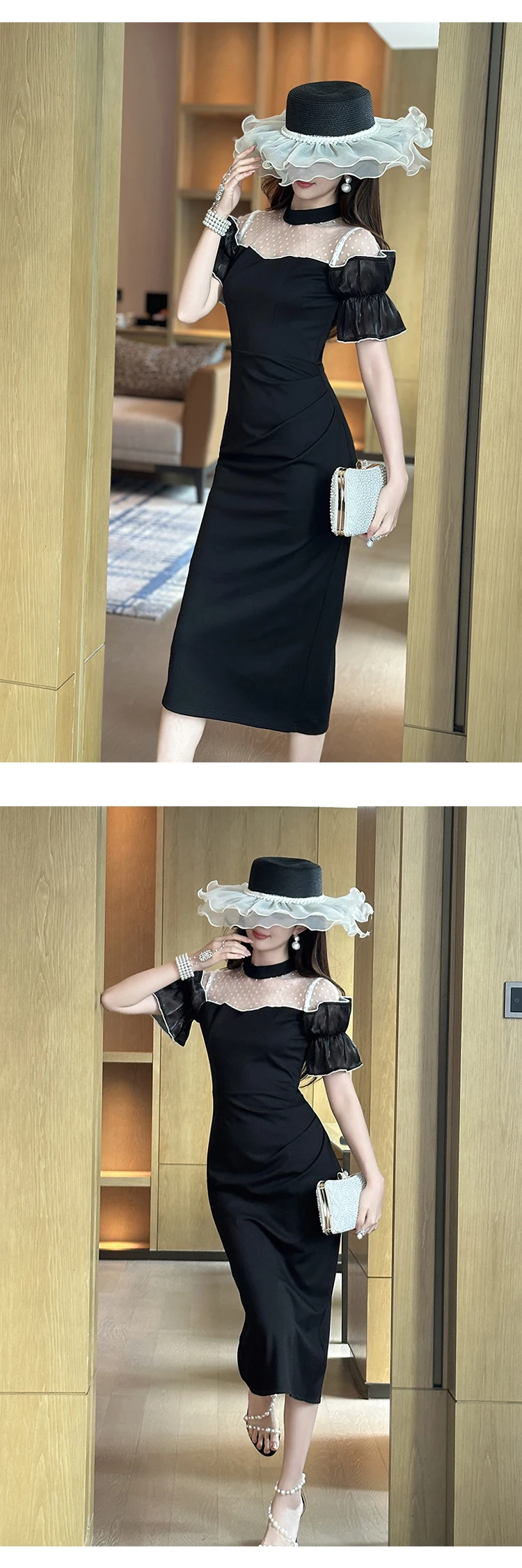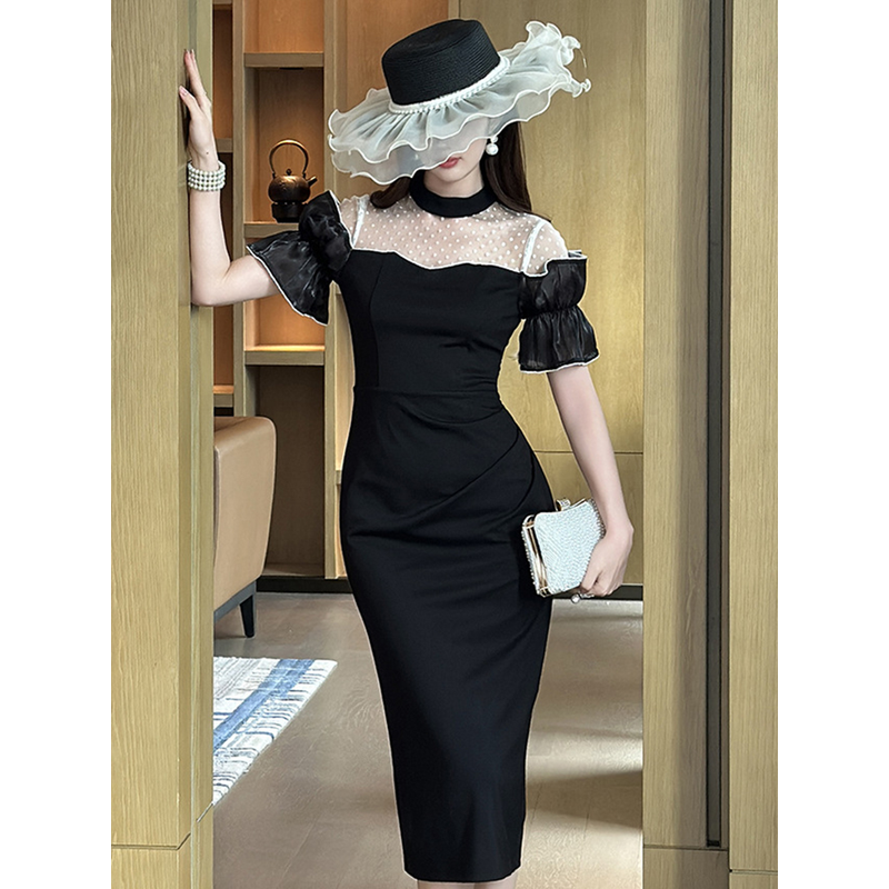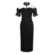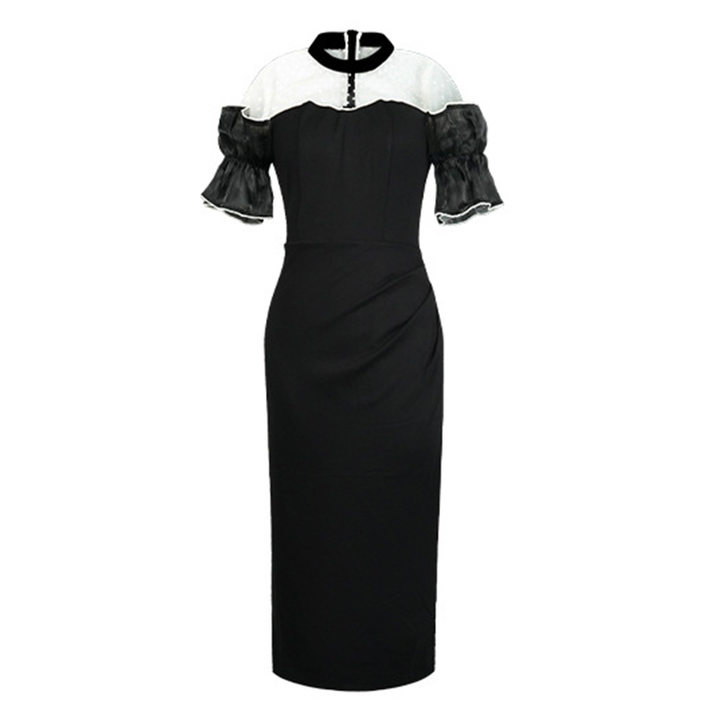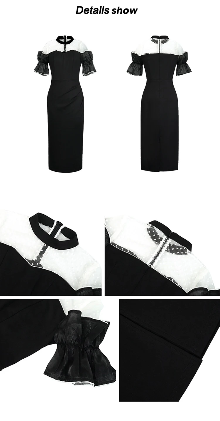 Women's Sweet White Dresses Female Chic White Sheer Mesh Splice Black Vintage Midi Robe Evening Party Vestidos Mujer