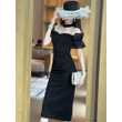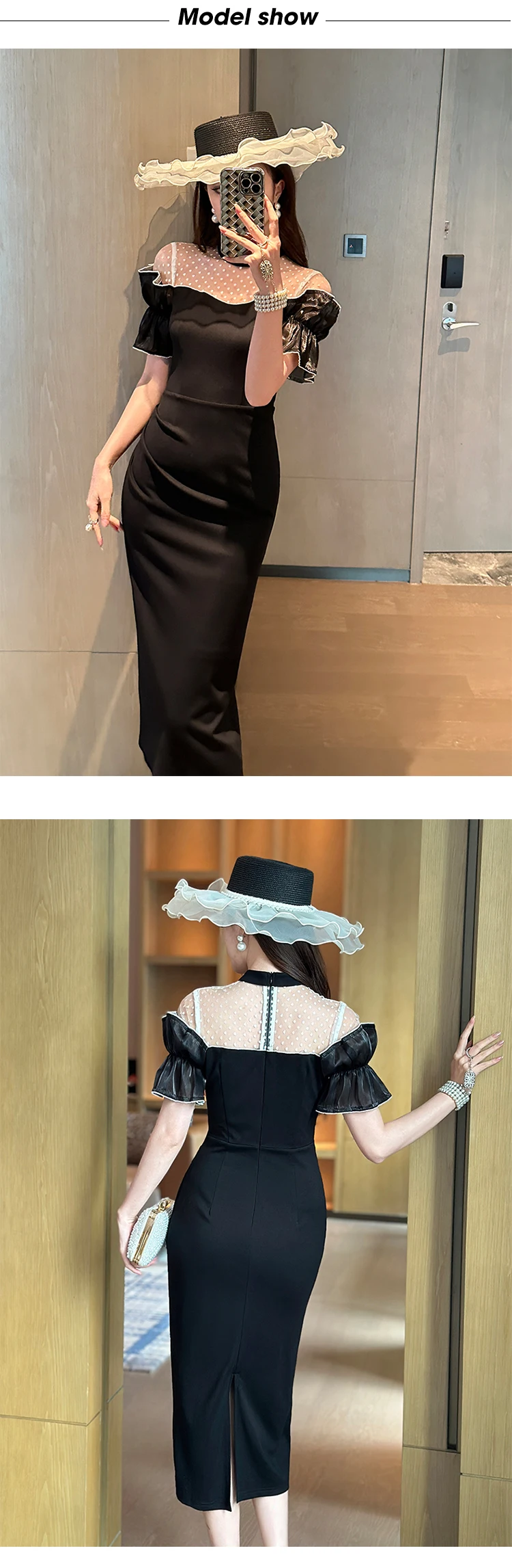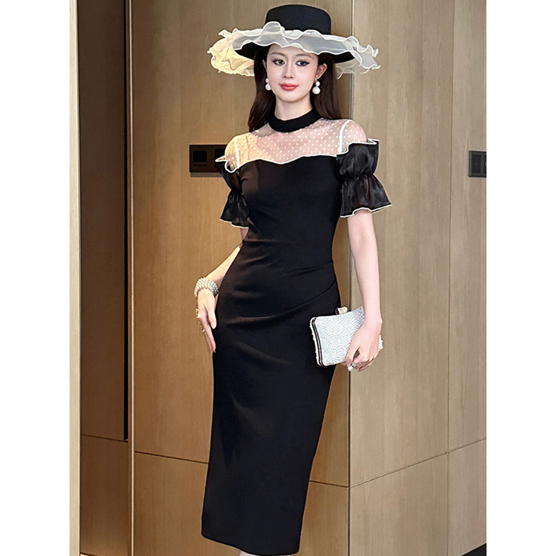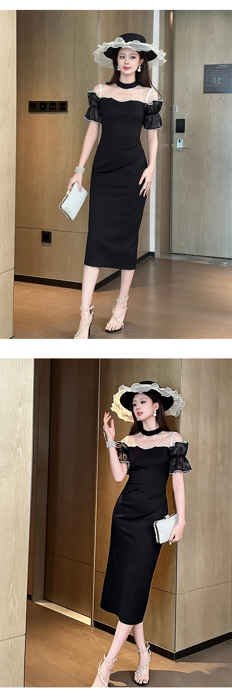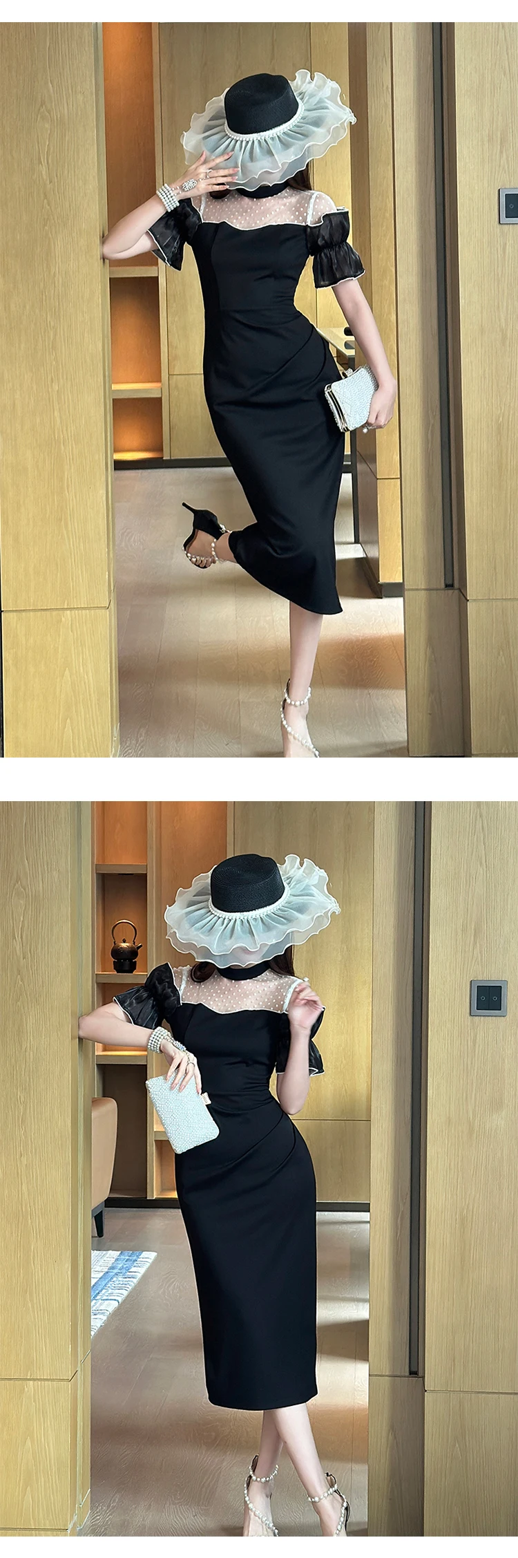 Women's Sweet White Dresses Female Chic White Sheer Mesh Splice Black Vintage Midi Robe Evening Party Vestidos Mujer