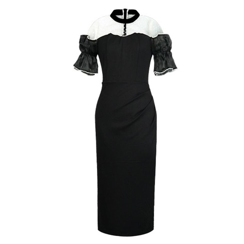 Women's Sweet White Dresses Female Chic White Sheer Mesh Splice Black Vintage Midi Robe Evening Party Vestidos Mujer