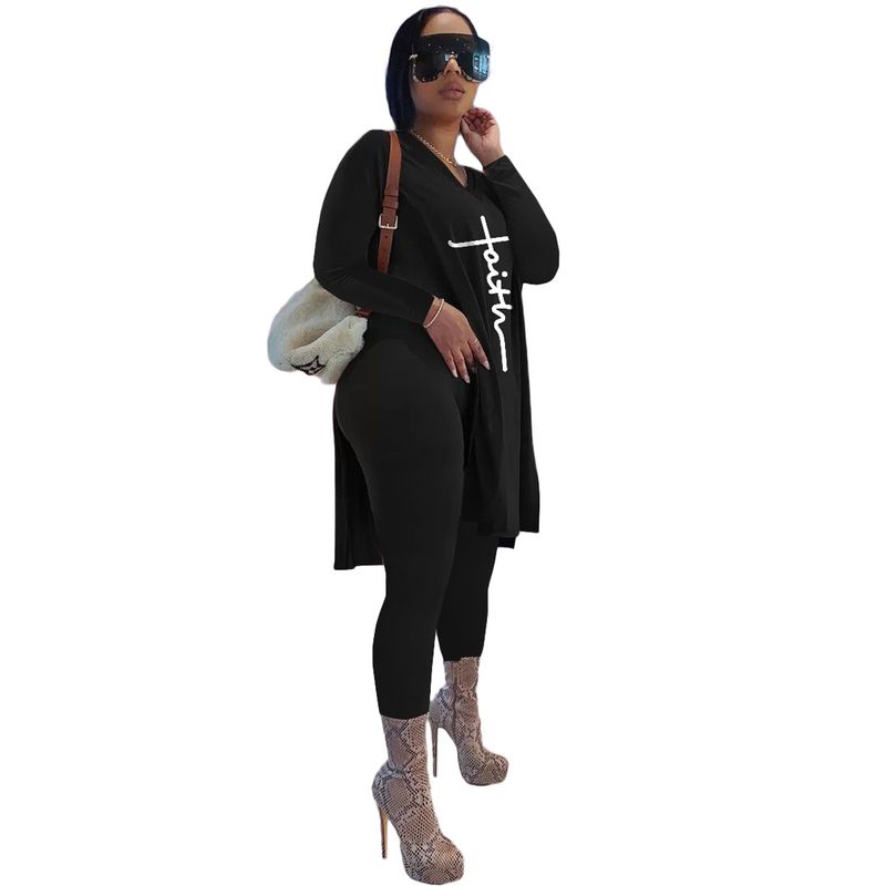 Women's Urban Casual Printed Long Sleeve Trousers Two Piece Set Black M