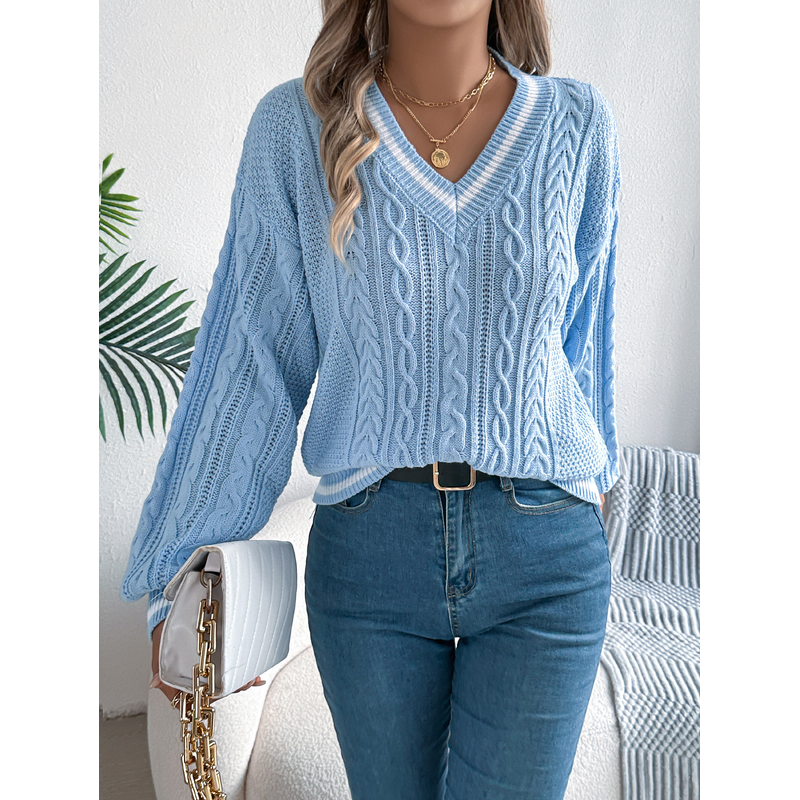Women's V Neck Cable Knit Sweater Color Block Long Sleeve Loose Casual Knitted Pullover Jumper