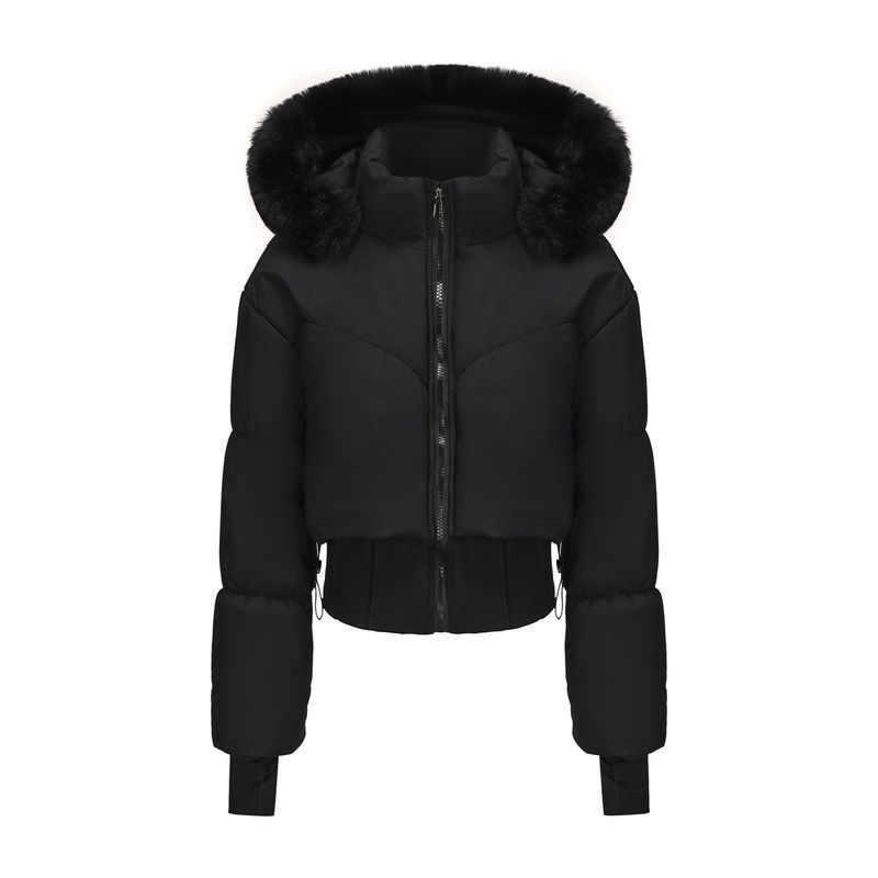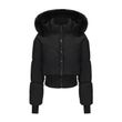 Women's Waist-tight Big Fur Collar Hooded Short Cotton Jacket Black L