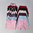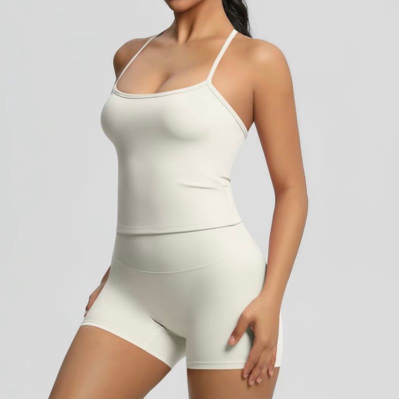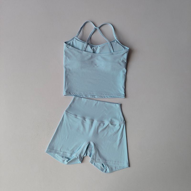 Hot selling yoga workout set with slim shoulder straps and yoga vest paired with high waisted, waist hugging, nude yoga three part shorts. Hot selling nude sports back with a strong core and a beautiful back vest. Comfortable with 80% nylon and 20% spandex stretch and support. Thin shoulder strap with hollowed out design embellishes the back contour, showcasing a perfect butterfly bone square neckline that outlines the collarbone curve and fits the body shape, making it easy to fold up the accessory breasts.